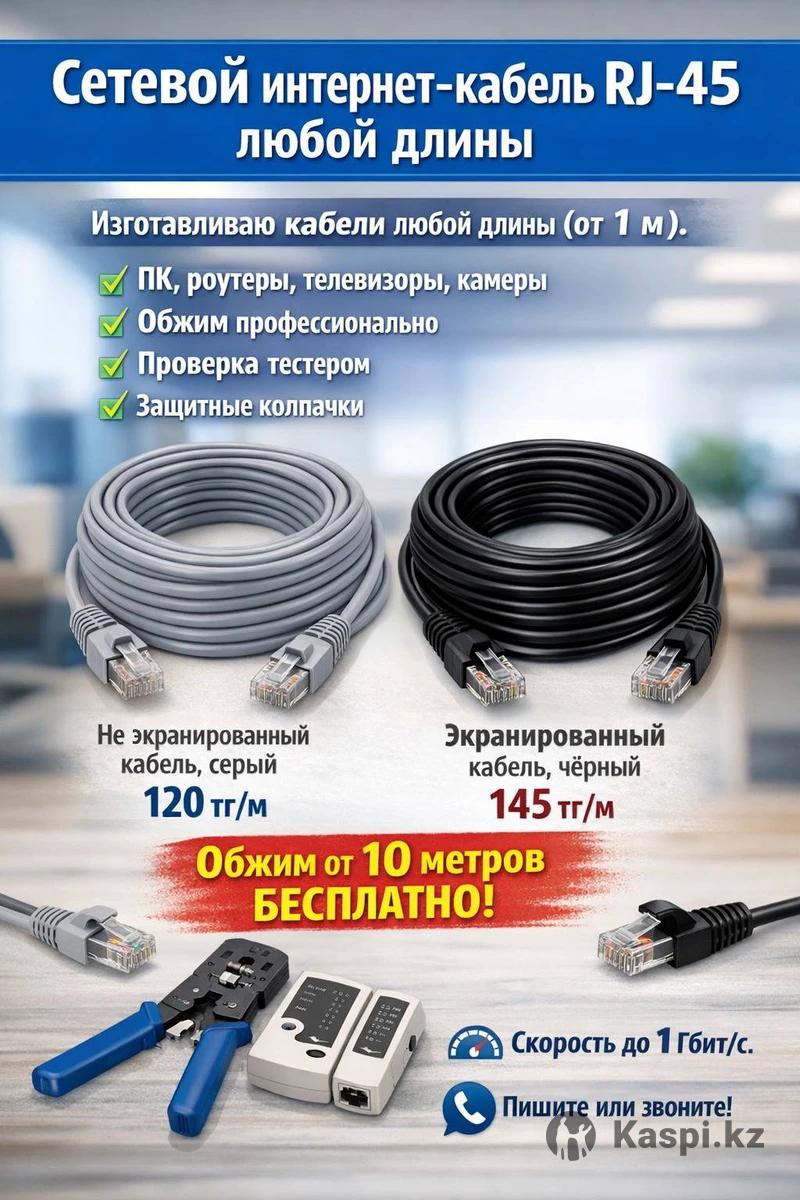 Сетевой интернет-кабель RJ-45 любой длины Изготавливаю сетевые кабели любой длины (от 1 м). Подходит для ПК, роутеров, телевизоров, приставок, видеокамер и интернета. - Обжим профессиональным инструментом - Проверка тестером - Защитные колпачки на разъёмах - Можно сделать кабель точно нужной длины В наличии: Не экранированный кабель, серый 120 тг/м Экранированный кабель, чёрный 145 тг/м Обжим от 10 метров бесплатно! Скорость до 1 Гбит/с. С делаю кабель любой длины. Пишите или звоните.
