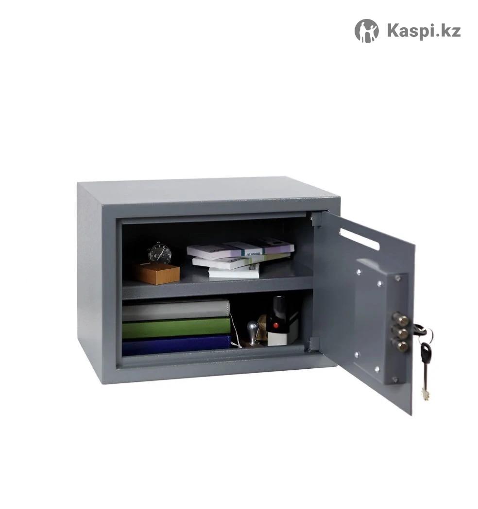 Дверь запирается ключевым замком, в двери сейфа предусмотрено специальное отверстие для закладки денег без доступа кассира содержимому. Корпус изготовлен из стального листа толщиной 1,2 мм, толщина лицевой панели - 2,8 мм. Размер 250х250х350 довольно тяжелый и прочный