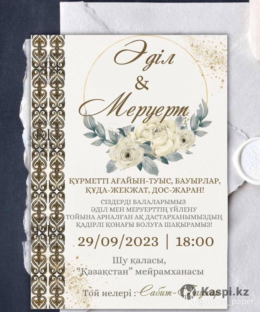 Әдемi дизаинмен жасалған шақыртулар. Фото мен видеосымен де болады Әр түрлі мерекелерге,тойларға,астарға,туған күн,сүндет той,тілашар,тұсау кесер және т.б. Бағасы 1500-3000 теңгеден Фото,видео ,жасанды интеллект,сайт 5000 теңгеден Толық ақпарат алу үшін жазыңыз: