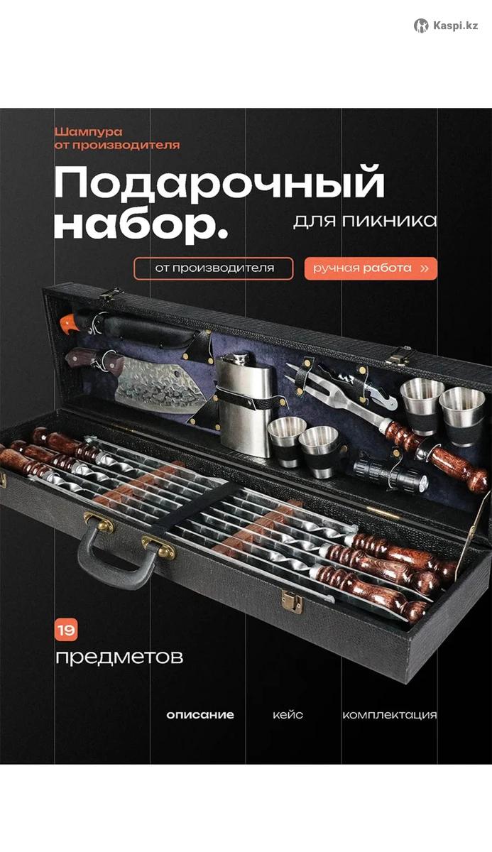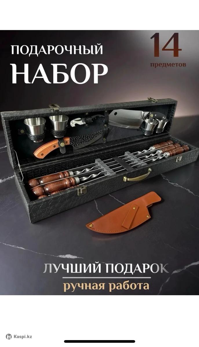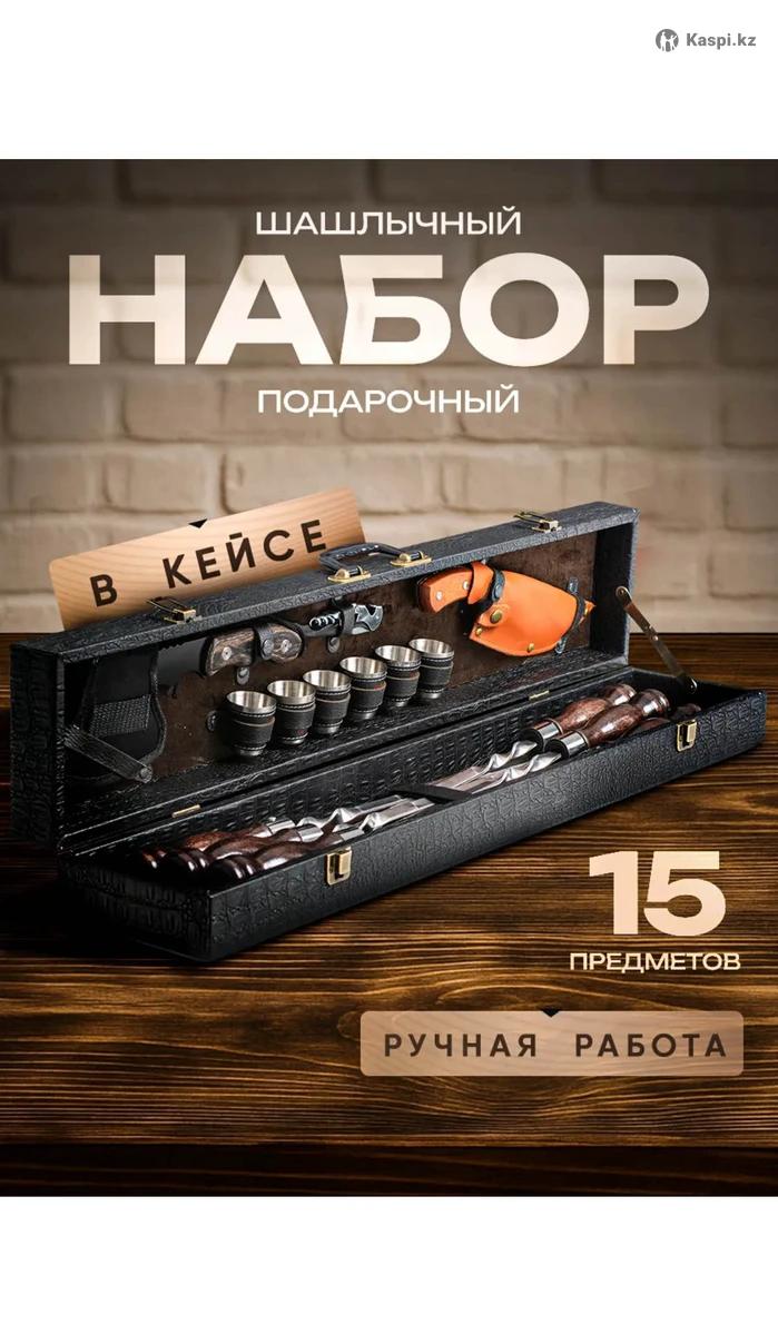 В продаже шашлычные наборы пр-ва Россия. Мужской мангальный инвентарь станет отличным сюрпризом для парня, лучшего друга или дяди. Наслаждайтесь отдыхом на даче, дома или на природе в компании семьи и друзей, готовя вкусные блюда! Кемпинговые приборы пригодятся охотнику, туристу и молодому шашлычнику во время похода или выезда загород. Отправляясь на туристический или охотничий маршрут - оригинальный комплект станет незаменимым спутником каждого приключения. Этот кейс содержит полезные товары и аксессуары: кизлярский нож, металлические предметы Цены от тг