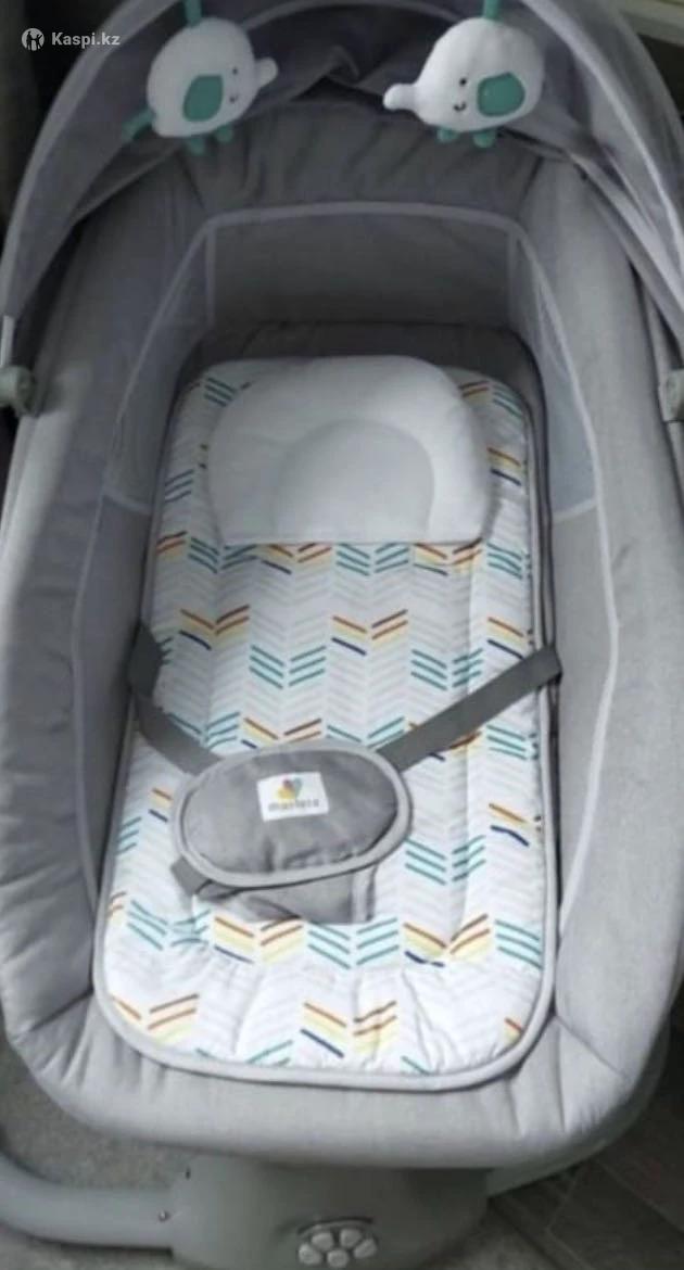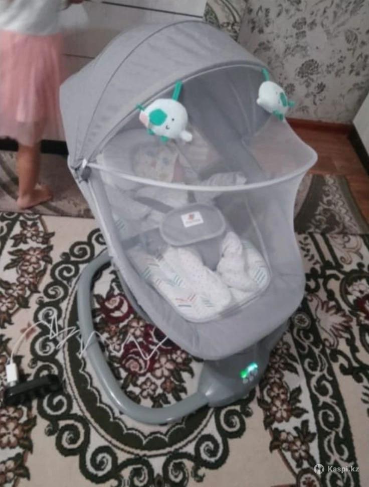 Прочный пластик, наследный металлический каркас, гипоаллергенный текстиль. Спальное место 7535см. Дополнительный съемный матрас, подголовник. Москитная сетка. 5 режимов укачивания.15 мелодий, таймер 15/30/45 мин. Пульт управления, занимает мало места, можно взять с собой на отдых, работает от батареек или от USB.