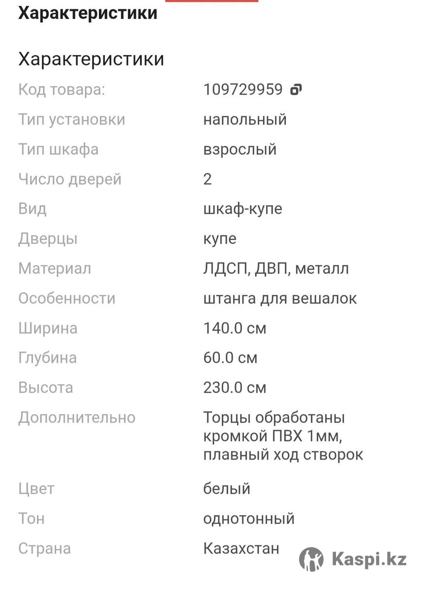 Шкаф купе, размер длина140_высота230_глубина60. В идеальном состоянии, брала на каспи в ноябре прошлого года, продаю в связи с переездом. Характеристики есть на фото во вложении