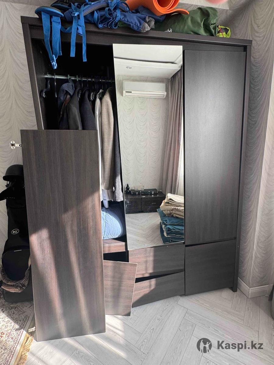 Шкаф темно-коричневый ширина 153; глубина 55; высота 210 Тумбочки ширина 51; глубина 38; высота 34.