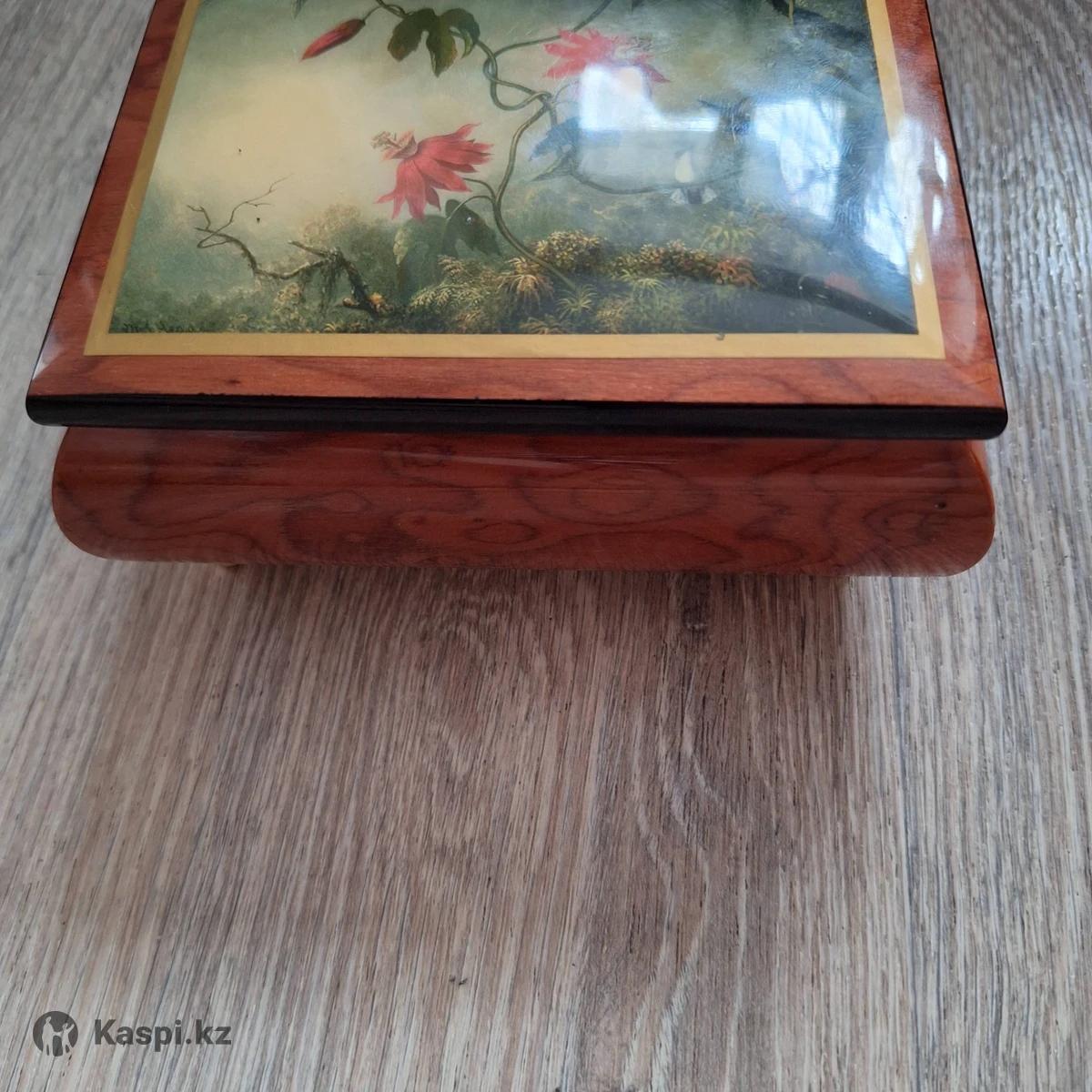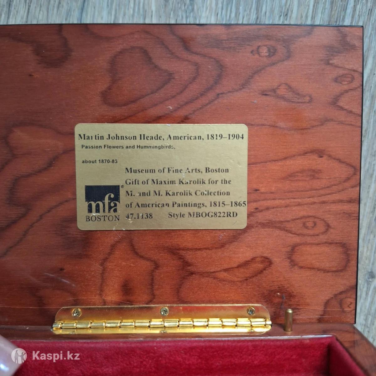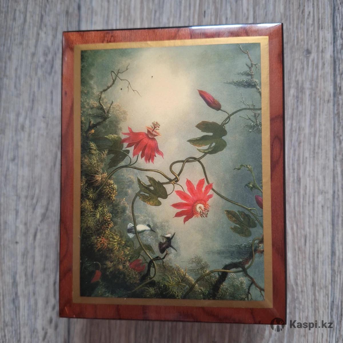 Шкатулка коллекционная с репродукцией картины «Страстоцветы и колибри». Картина: «Страстоцветы и колибри» (Passion Flowers and Hummingbirds). Художник: Мартин Джонсон Хед (Martin Johnson Heade). Сюжет: Пышная лиана с крупными красными цветками пассифлоры и колибри. • Изготовлено вручную, по одному экземпляру, из натуральной древесины в Италии мастерами-ремесленниками. Придаст классический шарм вашему интерьеру. • Музыкальная шкатулка украшена мягкими латунными ножками-подставками, обеспечивающими изысканность и защиту от царапин. • Поднимите защитную панель внутри, чтобы увидеть музыкальный механизм. Заводной механизм с поворотным ключом воспроизводит мелодию • Красивая, гладкая отделка с инкрустацией из дерева ручной работы, украшающая крышку музыкальной шкатулки. Внутренняя часть отделана мягким бархатом для защиты ваших ценных памятных вещей. Производство Италия. В отличном состоянии