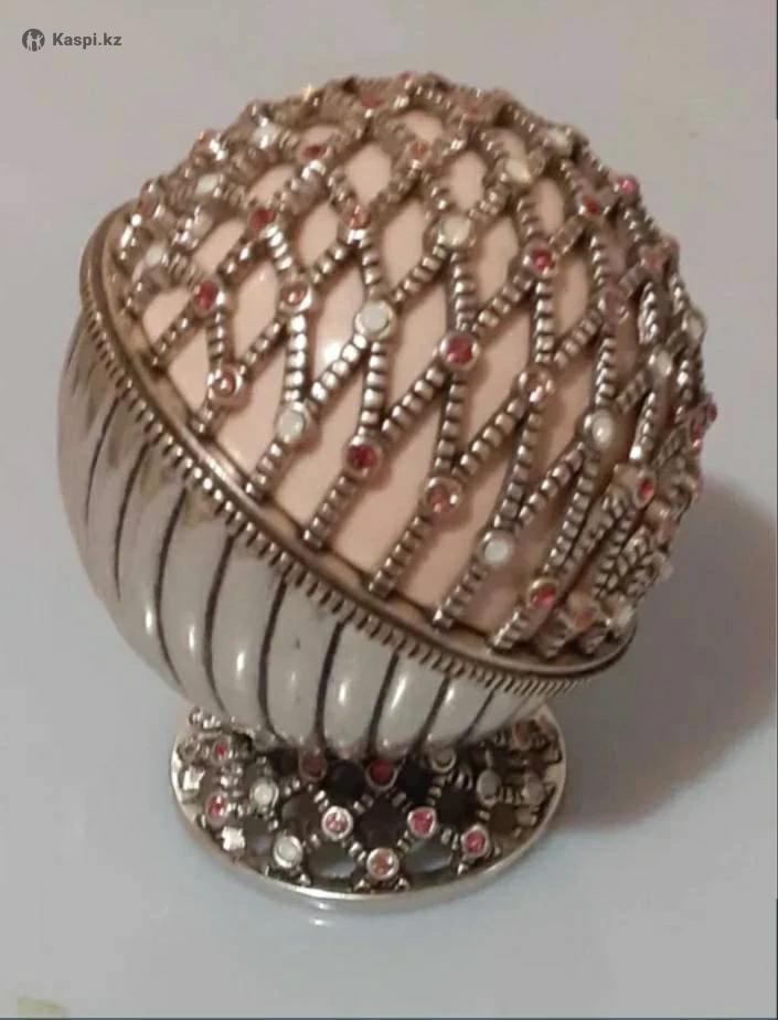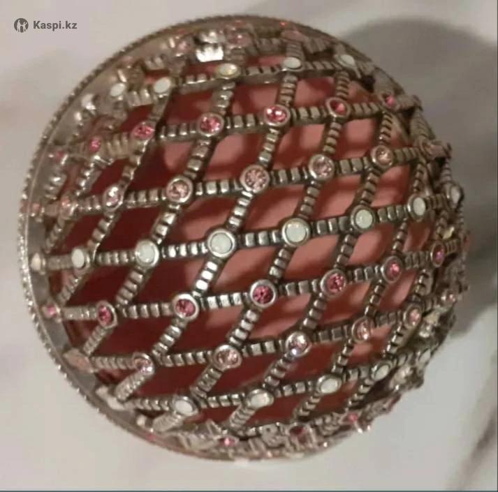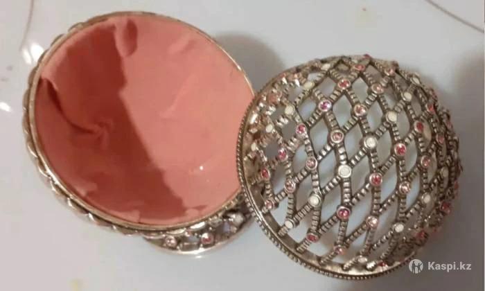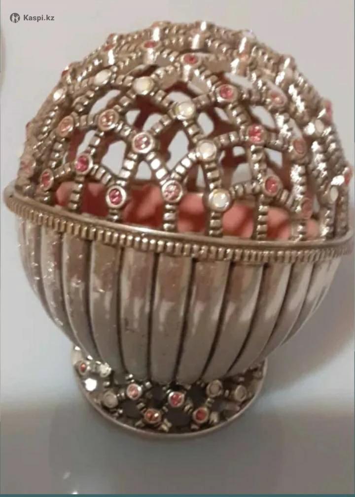 Изящная шкатулка в форме шара со съёмной крышкой. Изготовлена из прочного металла, имеет устойчивую форму. Выполнена ювелирным способом. Не была в употреблении, абсолютно новая. Упакована в подарочную коробку.
