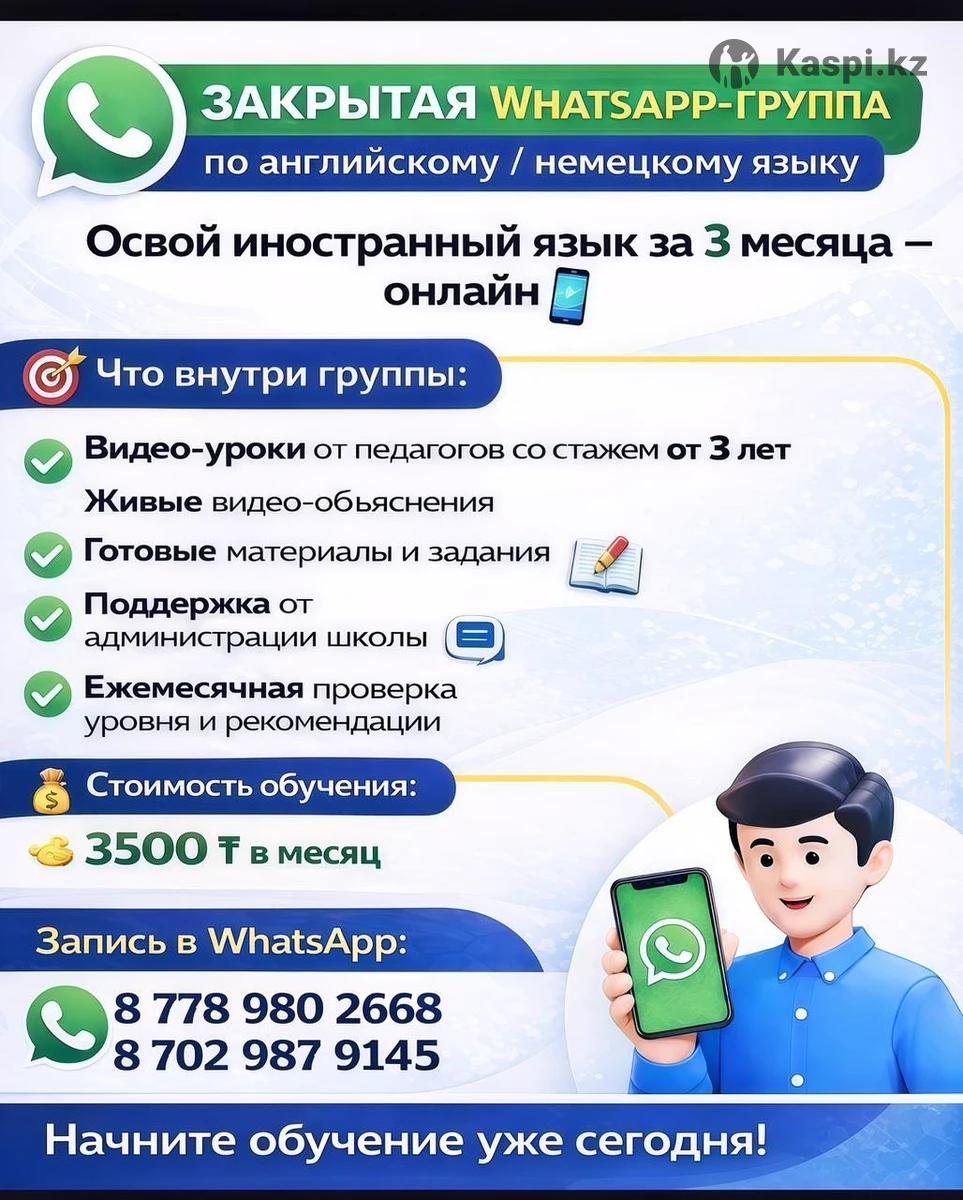 Здравствуйте, наша онлайн школа открывает набор в группу по английскому/немецкому 🏫 В этой группе вы сможете освоить иностранный язык за 3500 тенге в месяц🔥 instagram: Набор в закрытую группу по иностранным языкам в ! 🎯 В эту группу отправляем видео уроки с материалами от наших педагогов,по ним вы можете освоить английский за 3 месяца!!️ Вы получите 🎁 · материалы от педагогов со стажем от 3 лет · живые видео уроки · Поддержку от администрации школы · Ежемесячную оценку уровня-педагоги будут проверять ваш уровень английского и помогать продвигаться дальше 🏫 А стоимость подписки всего 3500 тг/месяц 🎁 НО СЕЙЧАС действует акция — 3 ДНЯ бесплатного изучения английского Не упустите возможность освоить английский всего за 3 месяца!!️ Запишитесь на бесплатный пробный период по ОБЯЗАТЕЛЬНО напишите что пришли от Эвелины, чтобы получить бесплатные уроки