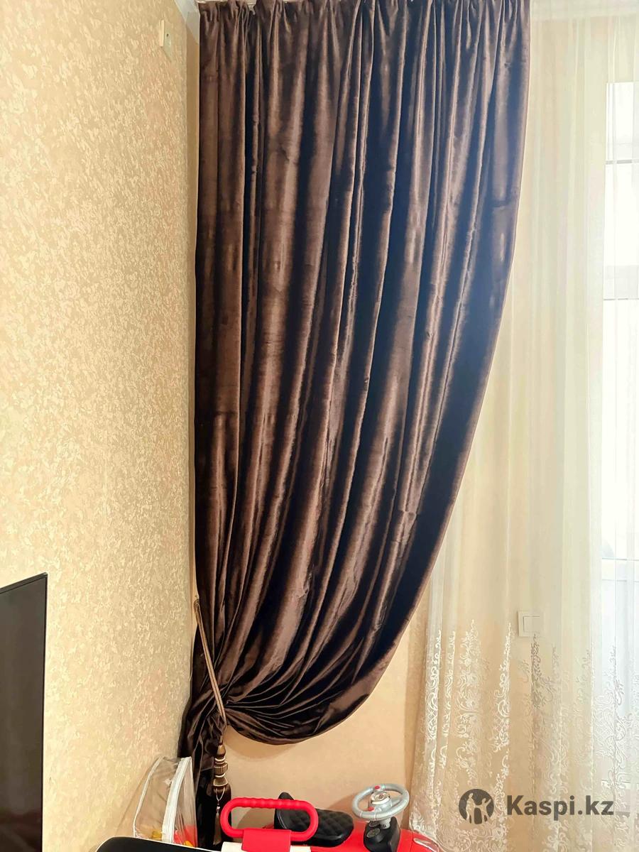 Шторы натуральный велюр, цвет шоколад, камера не передает. Высота 3 м, ширина где-то 8-9 метров за пару.
