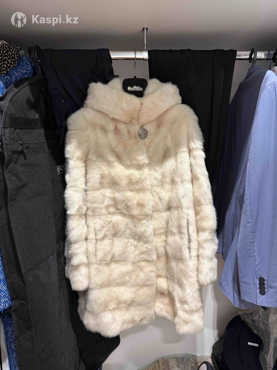 Белая шуба, очень красивая. Длиной ниже бедер на рост 170. Рукава отстегиваются до 3/4. Есть капюшон. Очень теплая на астанинскую зиму. БерекелI шуба. В идеальном состоянии, только подклад грязный немного стал, можно постирать или перешить, подобрав красивый подклад. На фото только вывесили из пакета, поэтому мятая. 200к Астана.