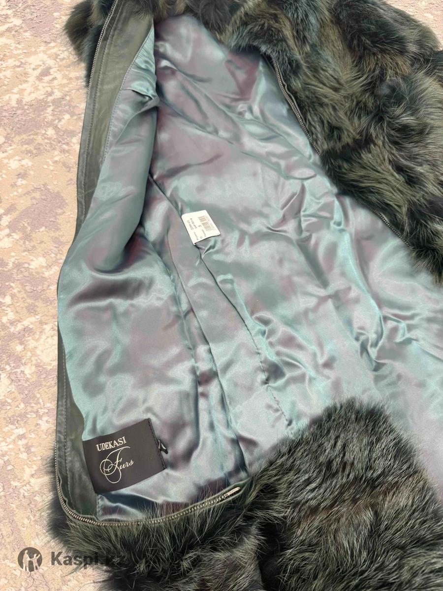 Удлиненная шуба безрукавка из натурального меха, изумрудного цвета