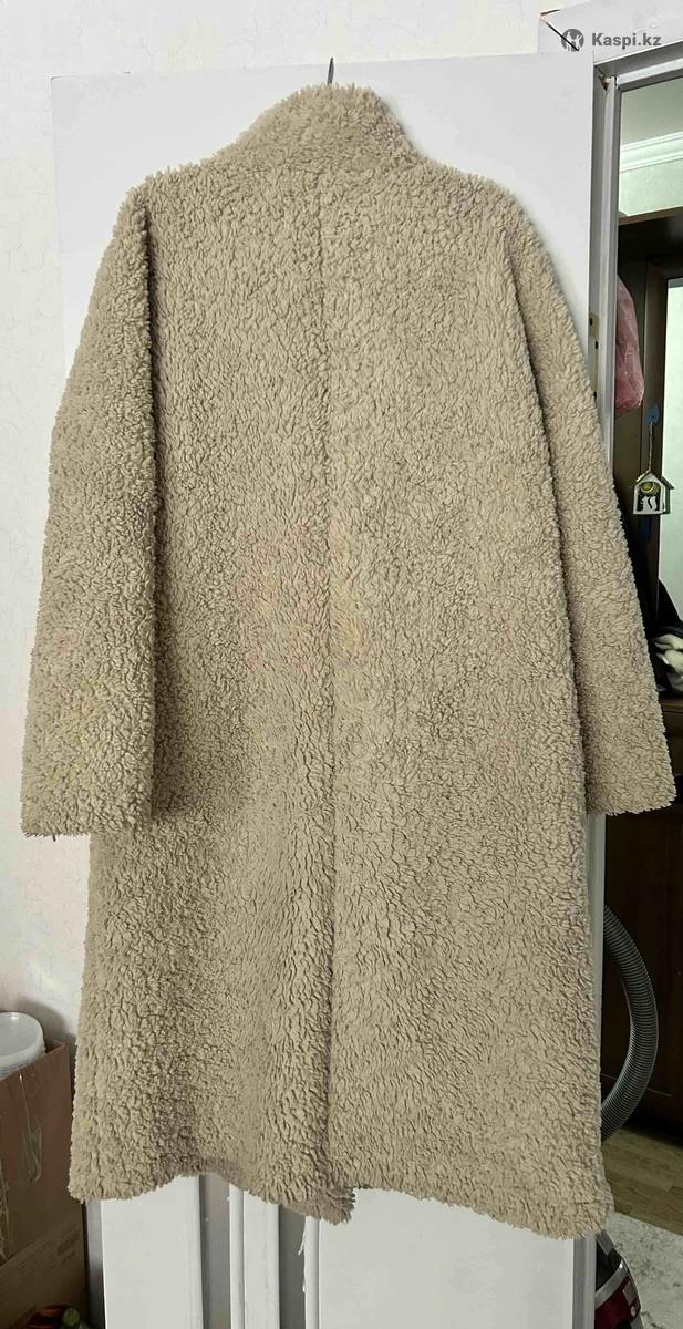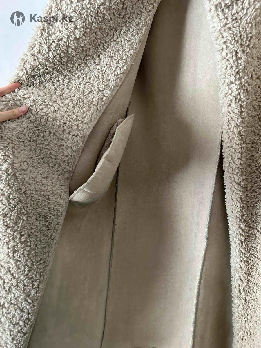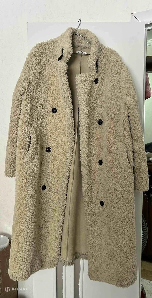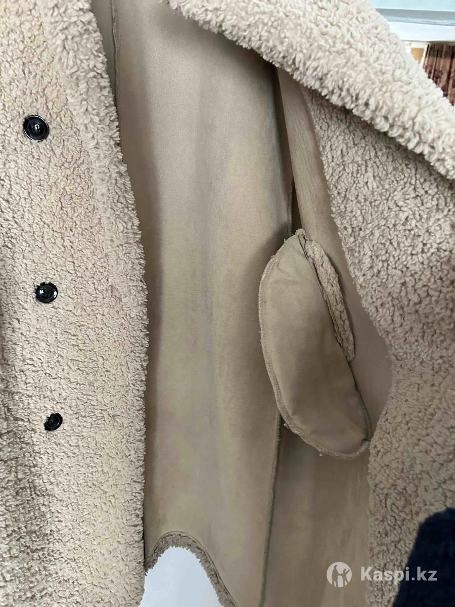 Шубка бежевого цвета, мягкий плотный материал, хорошо держит тепло. Двубортная застёжка на пуговицах, аккуратный стойка воротник, удобные карманы. Длина изделия 117см, длина рук 65