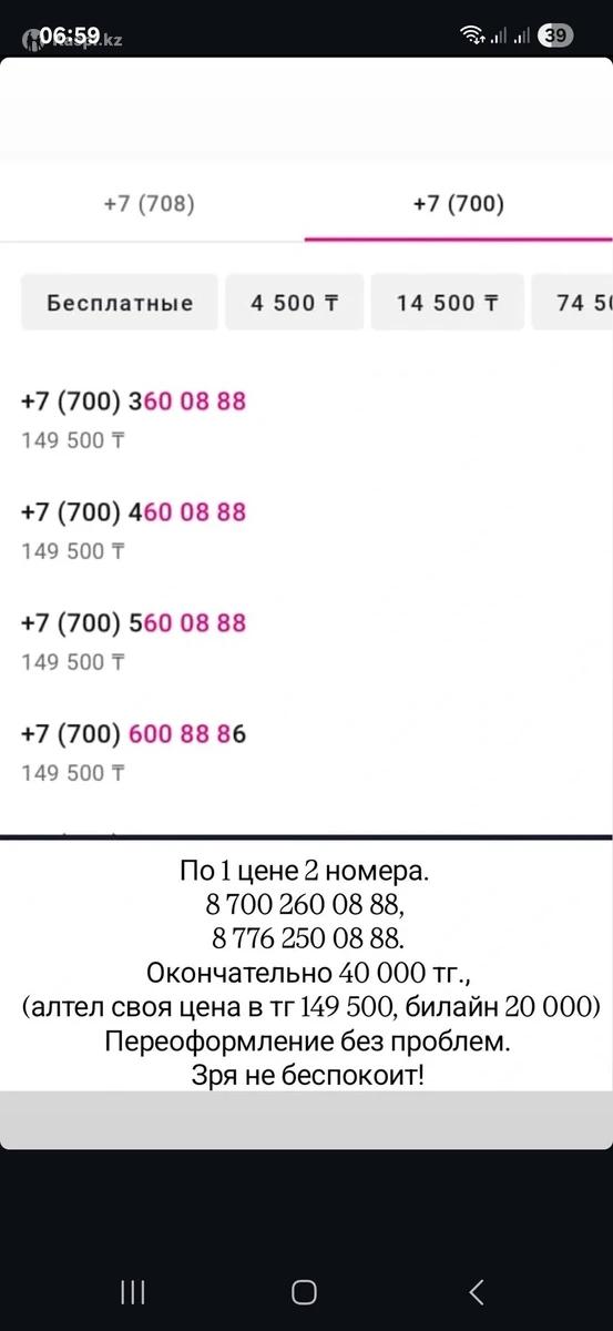 По 1 цене 2 номера. 87002600888, 87762500888. Окончательно 40 000 тг., (алтел своя цена в тг 149 500, билайн 20 000) Переоформление без проблем. Зря не беспокоит!