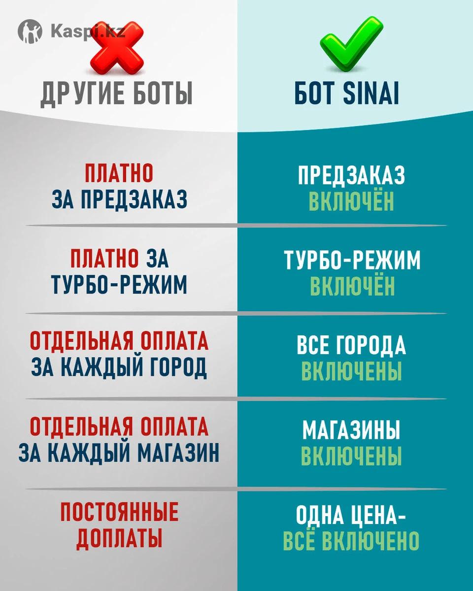 — умный бот для автоматизации продаж на Если вы продаете на Kaspi и хотите увеличить продажи без постоянного ручного контроля цен, бот SINAI решает эту задачу автоматически. Бот подходит для магазинов любого масштаба и работает полностью автономно. Возможности бота: Мониторинг цен конкурентов 24/7 Интеллектуальный демпинг без потери маржи Исключение собственных и партнерских магазинов из снижения цен Автоматическое обновление цен по заданным правилам Помощь в выходе в ТОП каталога Kaspi Работа без участия человека, даже когда вы офлайн Дополнительные функции: Аналитика продаж Kaspi Предзаказы без прайс листа в боте Печать накладных в один клик Условия: Тариф от 10 000 тенге в месяц Бесплатный тестовый период 14 дней с полным доступом Свяжитесь с нами в Подключим бота и настроим под ваши задачи бот для Kaspi магазина
