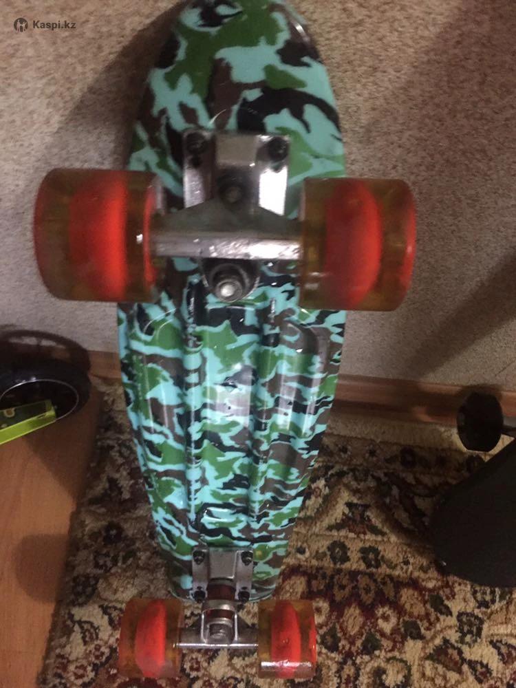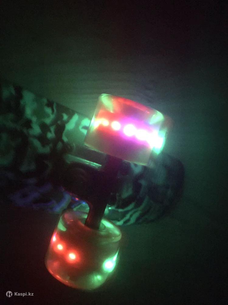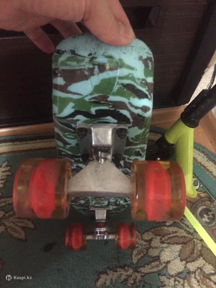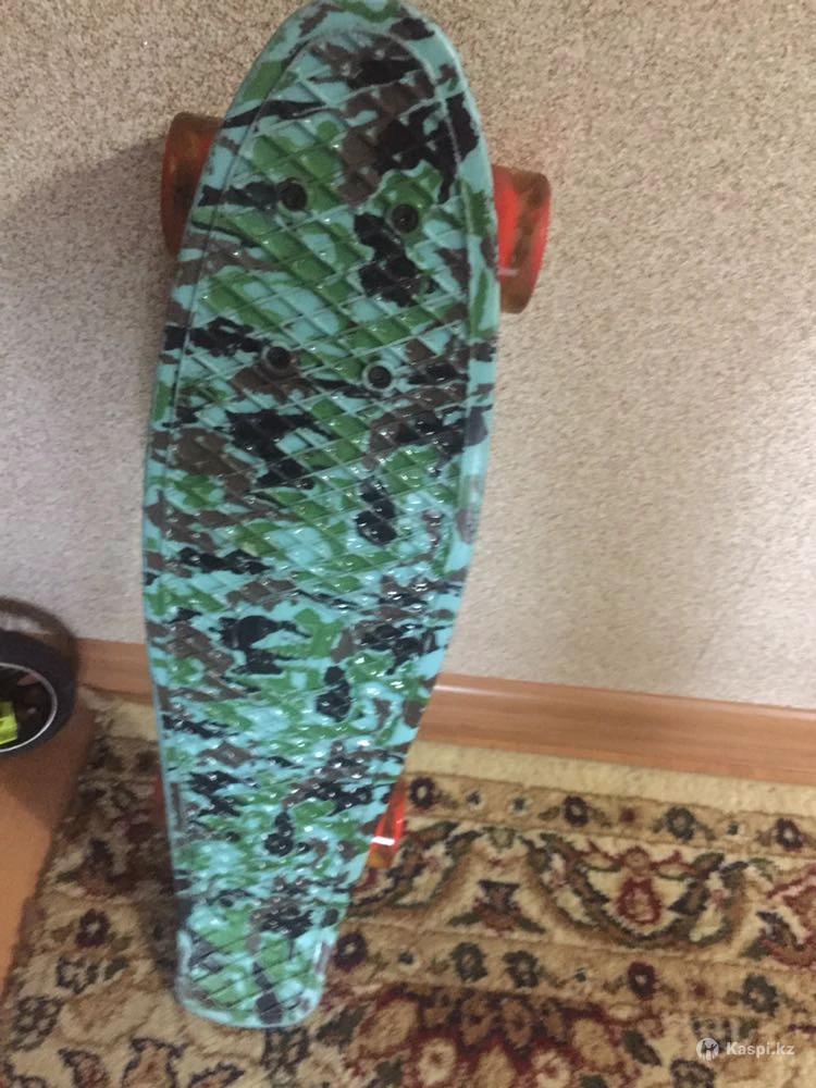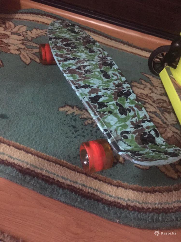 Скейтборд для детей, прочный, цвет стильный, крепления целые и надежные. Практически новый, брали месяц назад, колеса светятся в темноте.