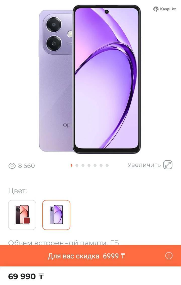 Продается новый в упаковке смартфон OPPO A5i 4G/64GB. Цвет фиолетовый. В магазинах цена 70000 тенге. Доставка есть по городу