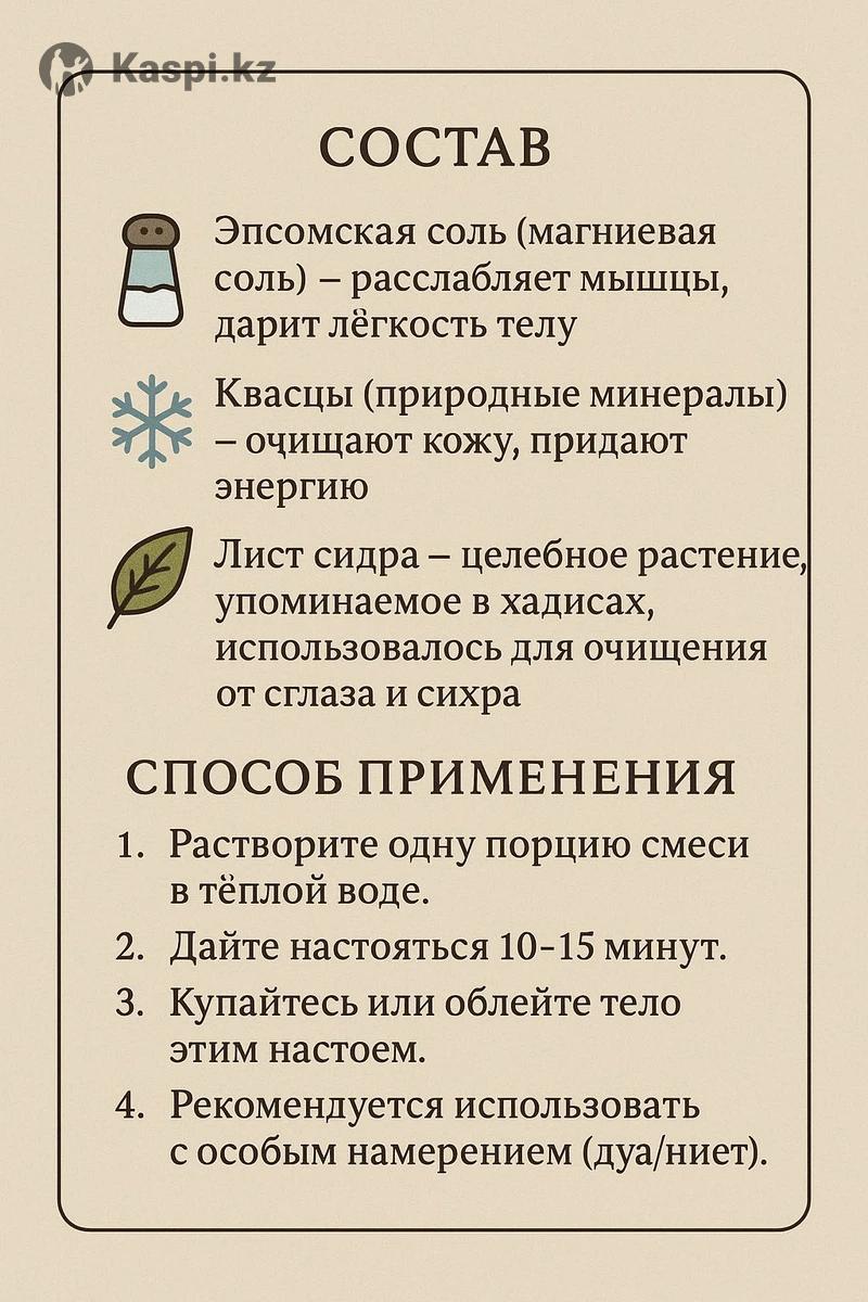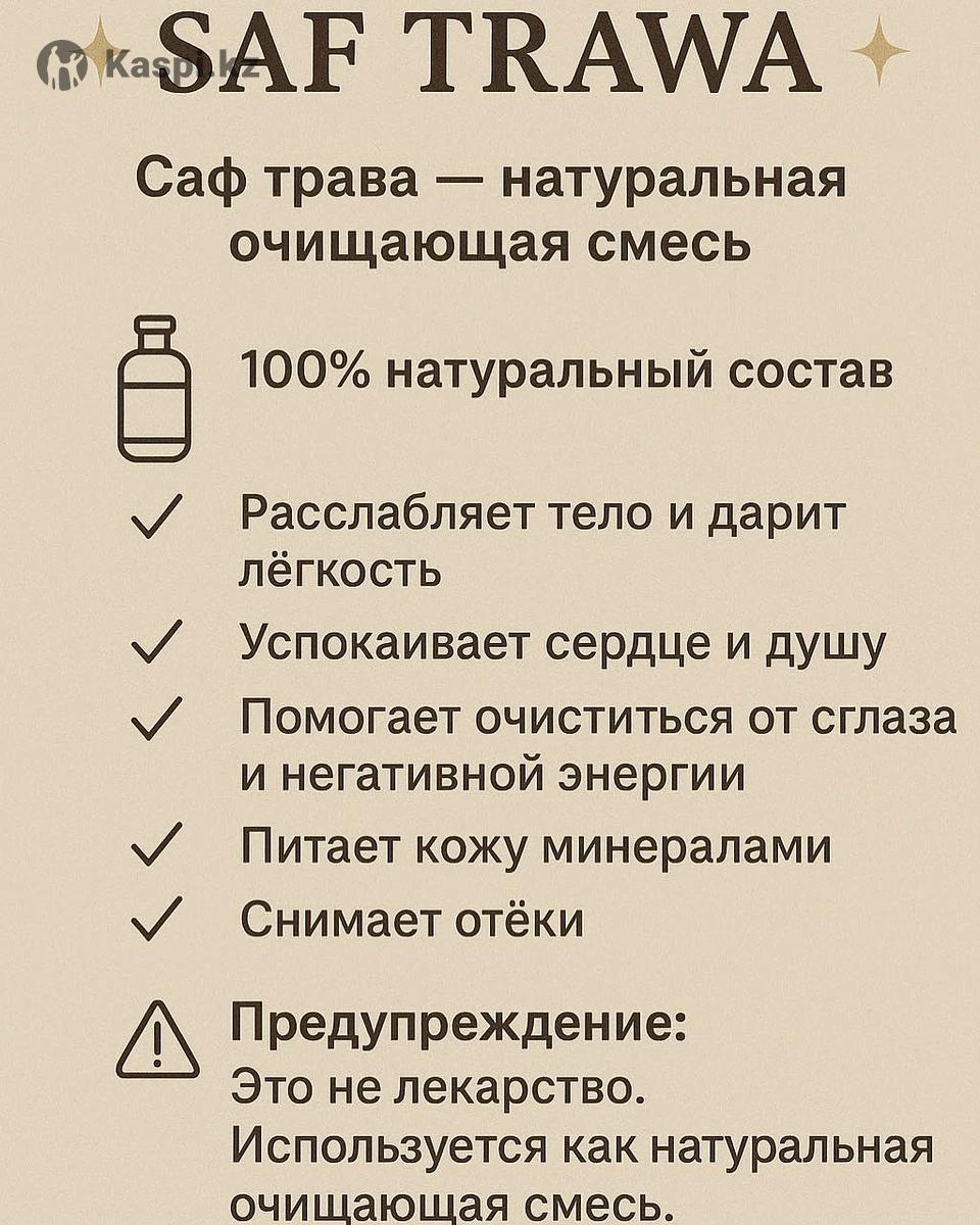 Проблеманы қозғау (бастапқы қызықтыру): – Соңғы уақытта өзіңізді түсініксіз шаршаңқы сезінесіз бе? – Үйде ауыр энергия, тіл-көз бардай мазасыздық байқала ма? – Ұйқыңыз тыныш емес, ал денеңіз жеңілдік іздей ме? Осындай кезде табиғи тазарту қоспасы «SAF TRAWA» көмекке келеді. Бұл – эпсом тұзы, квассы және сидр шөбінен жасалған арнайы қоспа. Хадистерде де сидр шөбі тіл-көз бен сихрден тазару үшін қолданылғаны айтылған. ✔ Барлығы табиғи ✔ Дене мен жанды жеңілдетеді ✔ Тіл-көз, жаман энергиядан тазартуға көмектеседі ✔ Әр қорап 7 күндік дайын курс – күнде бір пакет ашып қолдана бересіз 📦 Қазір қолжетімді: – 3 күндік курс — 40 000 тг – 7 күндік толық курс — 65 000 тг