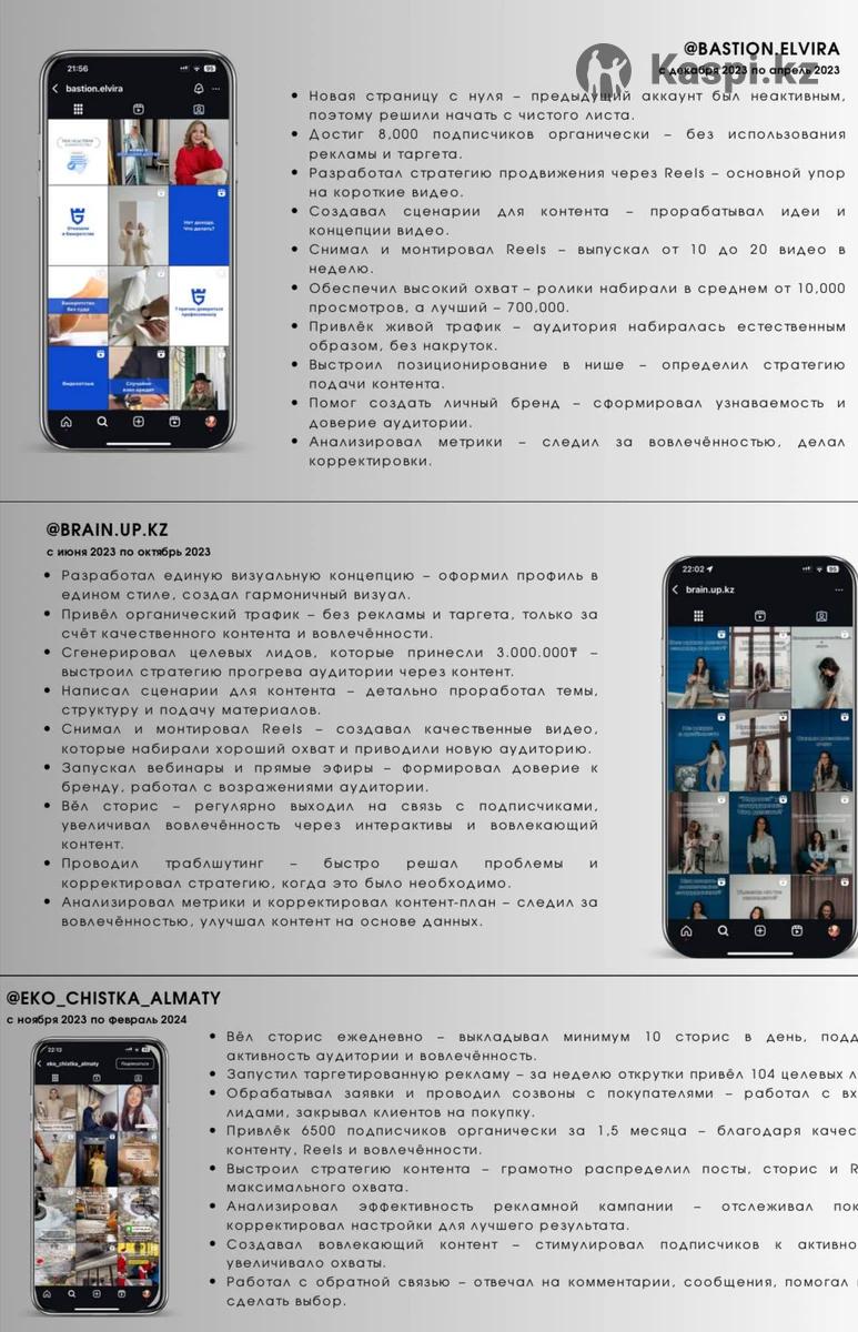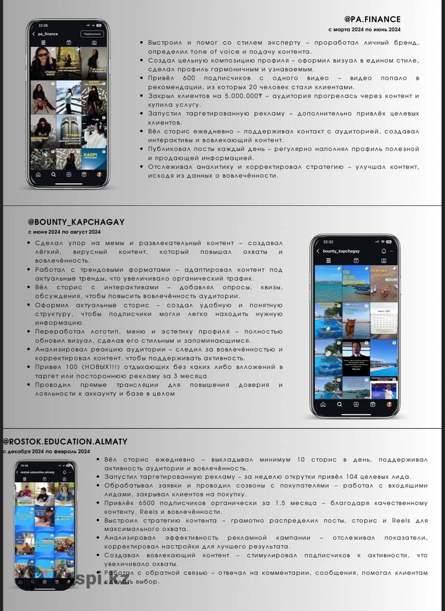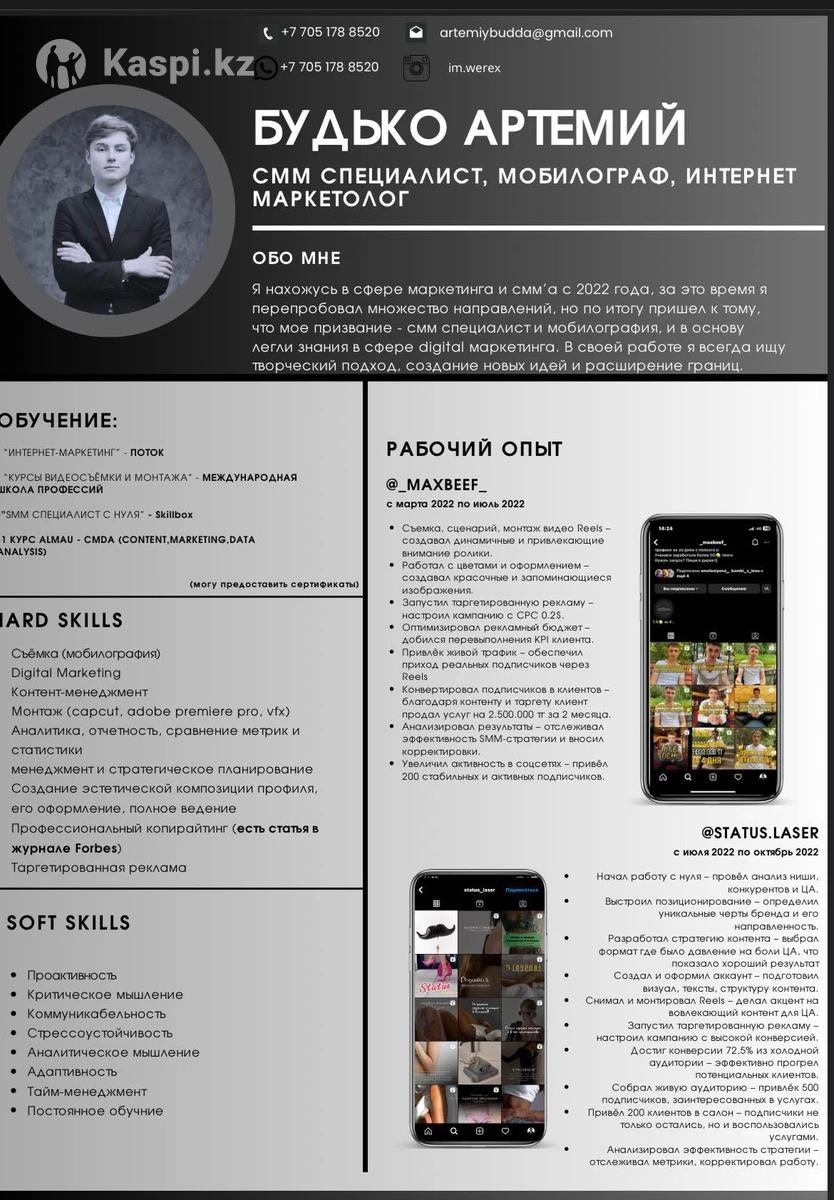 Я нахожусь в сфере интернет маркетинга и Сумма с 2022 года. Проходил множество обучений, которые я указал в своем резюме. За это время я успел поработать с 10+ аккаунтами, сделать множество выездных/одноразовых съемок, мои работы крутились креативами в таргете и принесли в сумме около 1000 лидов. Я владею всеми навыками нужные для СМС, маркетинга, анализа и ведения отчетности: •разрабатывать контент-стратегии с выстраиванием воронки продаж 📈 •сторисмейкинг, видеомейкинг, копирайтинг (прохожу стажировку в Forbes) 🪙 •имею навыки фото- и видеосъемки, монтажа (Capcut, Davinci Resolve, Premiere Pro) 📷 •Владею графическими программами (Canva, Photoshop, Illustrator) 🎨 •запуск таргетированной и контекстной рекламы через Facebook и Google ADS. 📢 •анализ метрик, выявление гипотез и выстраивание стратегии ♟️ •написание контент плана, придумывание идей, подготовка и проведение съемки 🎬 •владею полным пакетом программ Office. В особенности отлично пользуюсь Excel для ведения различной отчетности 💻 Буду рад обсудить возможное сотрудничество и рассказать больше о своем опыте. Портфолио и резюме могу отдельно отправить Спасибо за внимание! Будько Артемий
