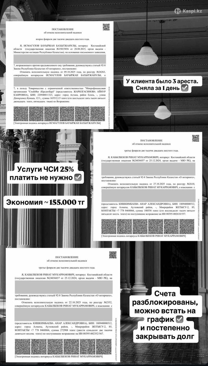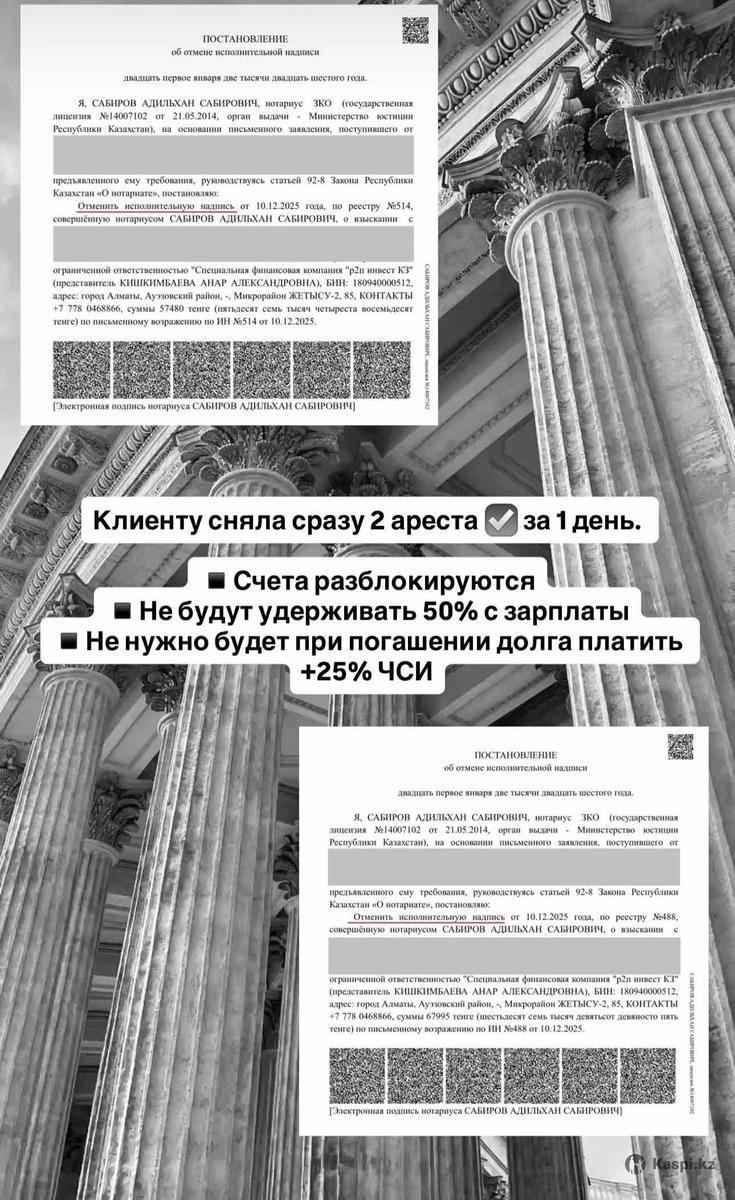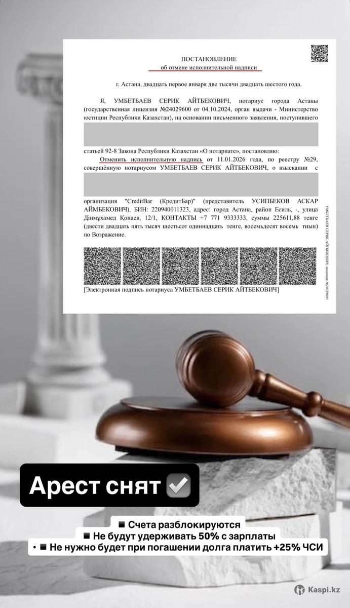 Сниму аресты в РК за 1–3 дня! ✔ Не нужно платить услуги ЧСИ ✔ Разблокирую все банковские счета и карты ✔ Полное восстановление доступа к средствам ✔ Снимаю аресты через суд ✔ Убираю запрет на выезд из РК Работаю быстро и законно. Консультация бесплатно.