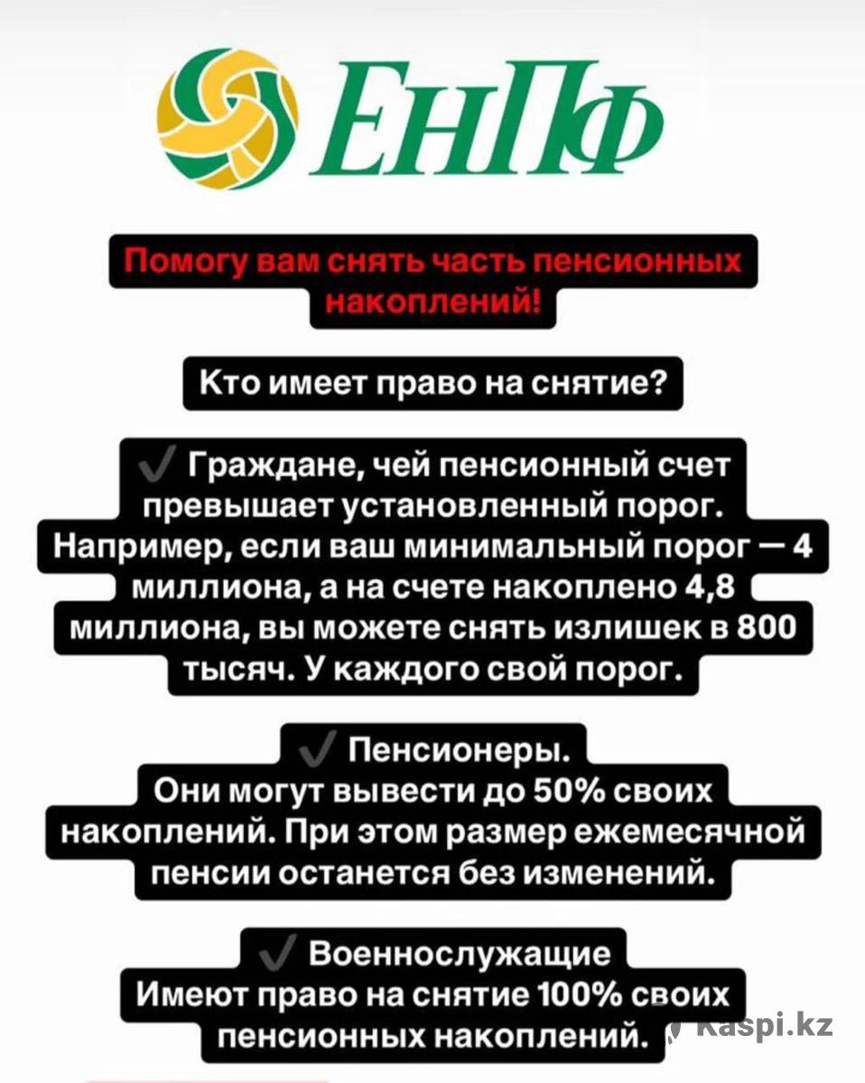 Снятие пенсионных накоплений.Срок выполнения работы от 7до 14 рабочих дней . Помогу вам снять часть пенсионных • накоплений! | Кто имеет право на снятие? Граждане, чей пенсионный счет превышает установленный порог. Например, если ваш минимальный порог - 4 миллиона, а на счете накоплено 4,8 миллиона, вы можете снять излишек в 800 тысяч. У каждого свой порог. • Пенсионеры. Они могут вывести до 50% своих накоплений. При этом размер ежемесячной пенсии останется без изменений. Военнослужащие Имеют право на снятие 100% своих Пенсионных накоплений