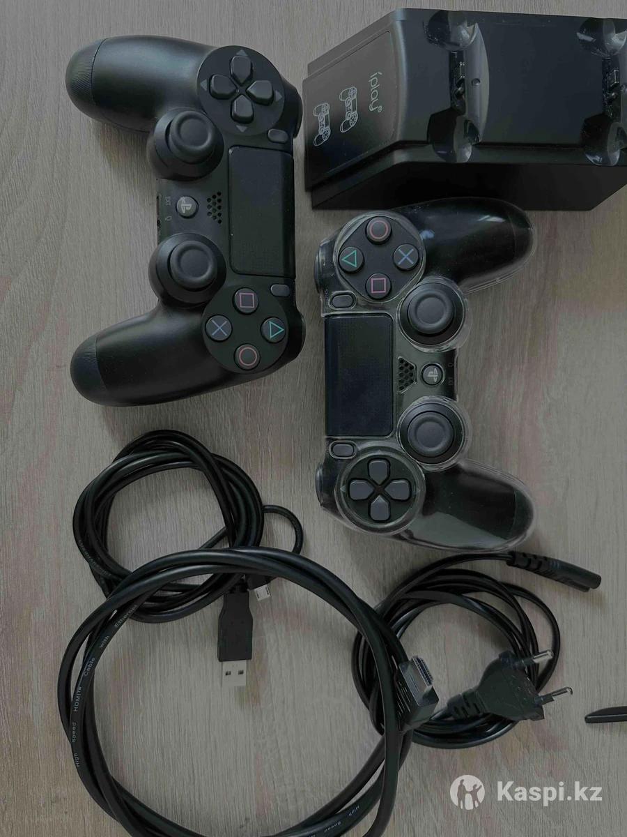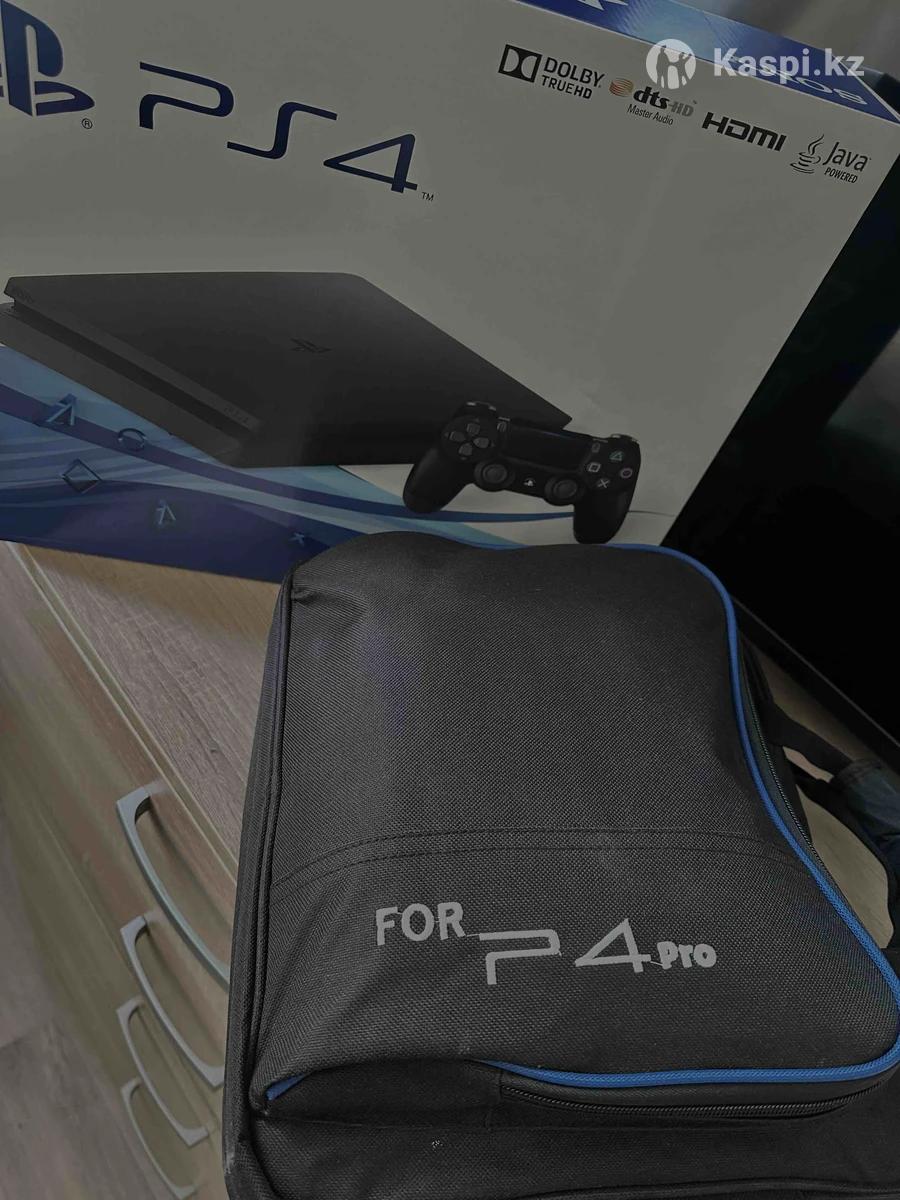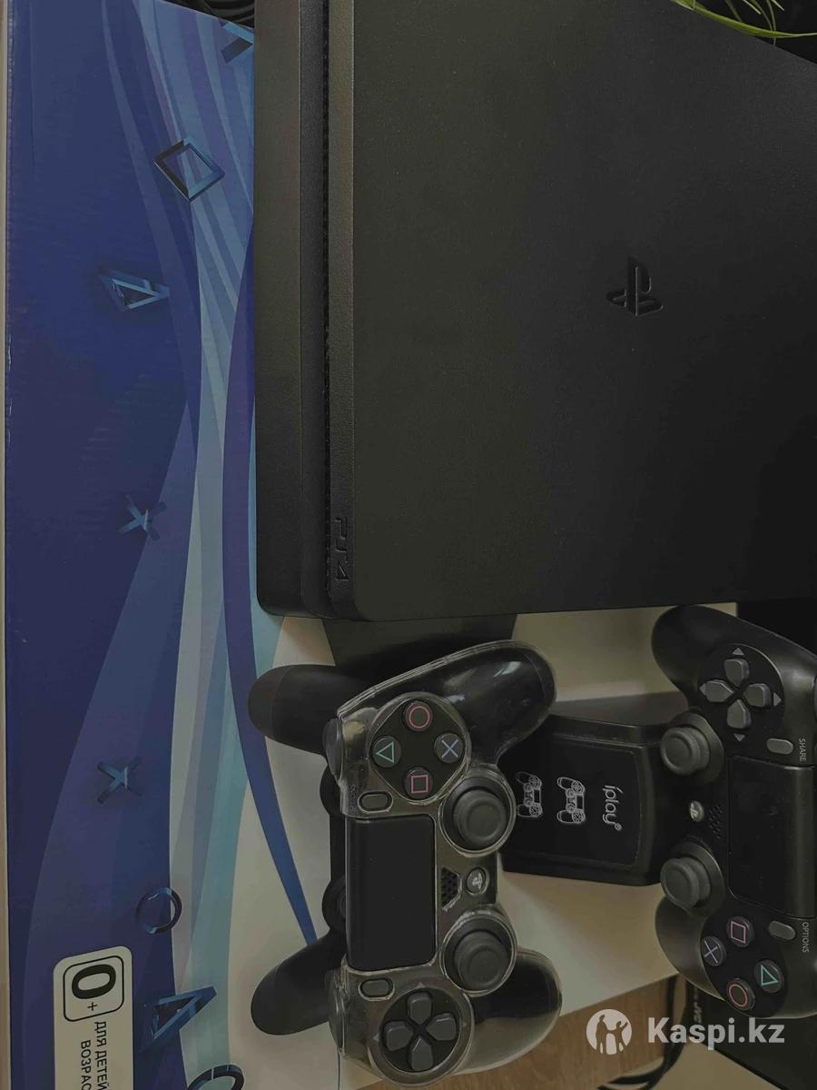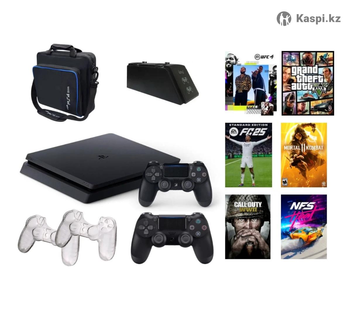 Sony PlayStation 4 Slim 1 TB + сумка + чехол + зарядная станция + геймпад + GTA5 + UFC4 + MK11 + FC25 + NFS + COD Игры встроены без дисков. Покупали через Kaspi в мае 2025 работает все. Продажей не спешу. Обмен есть, пишите на что.