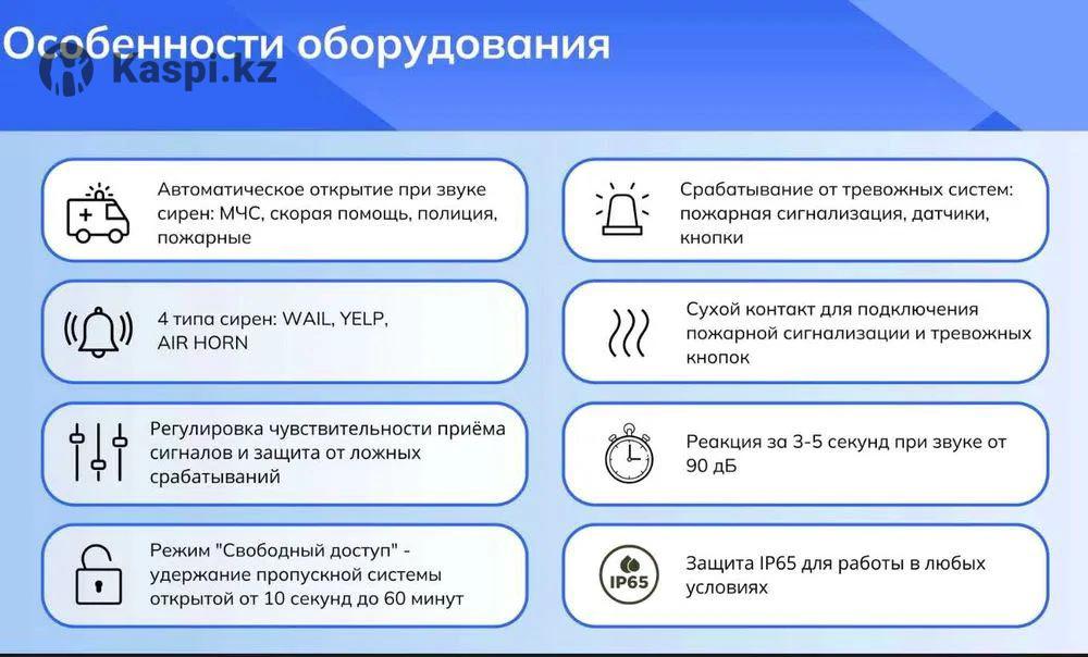 Акустический детектор сирен, предназначен для распознавания звуковых сигналов спецтранспорта, с передачей сигнала на открытие шлагбаума Автоматическое распознавание характерных звуковых сигналов спецтранспорта при звуковом давлении от 90 дБ до 120 дБ: WAIL (500-1500 Гц), YELP (500-1100 Гц), AIR HORN (500-1800 Гц).