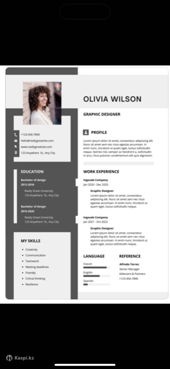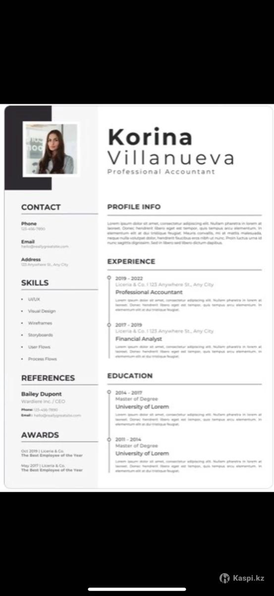 Составляю успешное резюме/CV на русском, казахском и английском языках. Как с нуля, так и корректировка имеющегося. Делаю и в профессиональном дизайне в pdf, и для сайтов (хэдхантер) и LinkedIn. Опыт – 7 лет. Работаю четко в срок. Усиливаю все Ваши достижения. Делаю авторскую распаковку личности и опыта. Качество гарантировано. – Обладатель сертификата IELTS с продвинутым уровнем владения английского языка (Advanced); – Бакалавр Международного Права, Факультет Международных Отношений, КазНУ им. аль-Фараби, красный диплом; – Магистр Экономики, Университет КИМЭП, обучение полностью на английском, красный диплом; – Стипендиат гранта ERASMUS, Университет Глазго, Великобритания. Грамотно составленные мной резюме, CV подходили для как для программы обмена ERASMUS, в компанию Mars, Hilti, для стипендии Sur-Place, стажировки INKOMPASS, а также в следующие университеты: США (University of Southern California, Duke, UC Berkley, George Washington, Boston University, Bentley University, Northeastern и др.), Великобритании (University of Glasgow, Bournemouth University, Sheffield University, University of Leeds и др.), Европы, Кореи, Новой Зеландии, России, в том числе по стипендиям ERASMUS, Болашак, Common App, Hungaricum, Global Korea Scholarship (GKS) и др. Чтобы узнать стоимость и получить примеры работ, пишите на , пожалуйста (на звонок не всегда могу ответить):