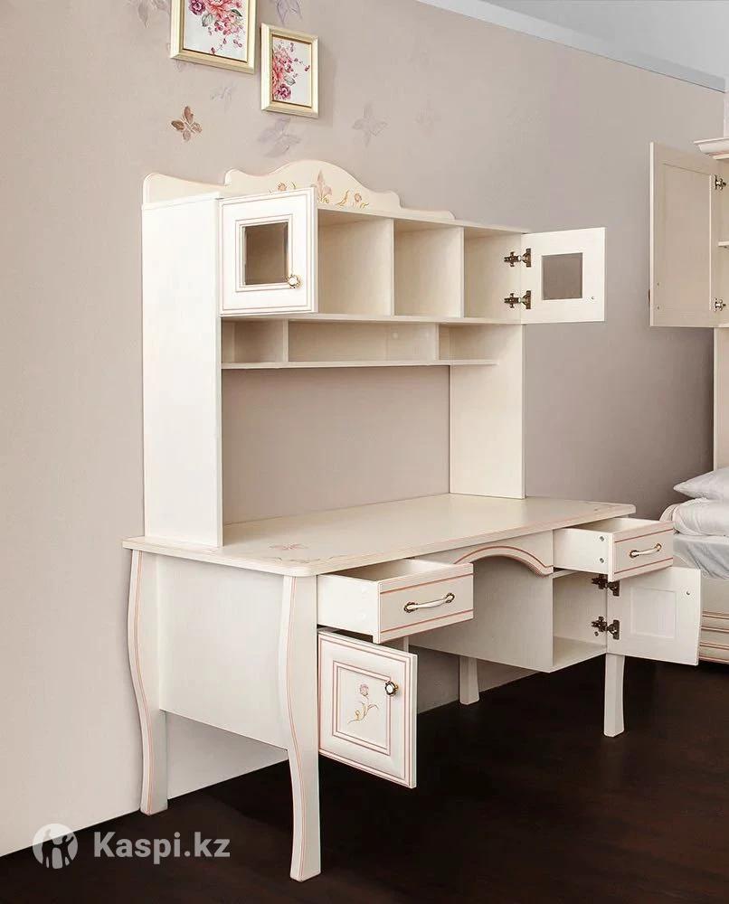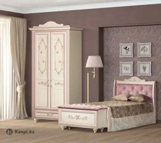 розовые шторы и ортопедический матрас В ПОДАРОК! Гарнитура Российского качества. Легкое дерево специальной разработки(даже дети смогут передвинуть кровать). Кровать 90х200см Мягкое изголовье. Шкаф 120х60х230см Парта с полками 70х180х80см примерно. Все в отличном состоянии! Поверхность качественная, покупали за 400.000тг Писать и звонить