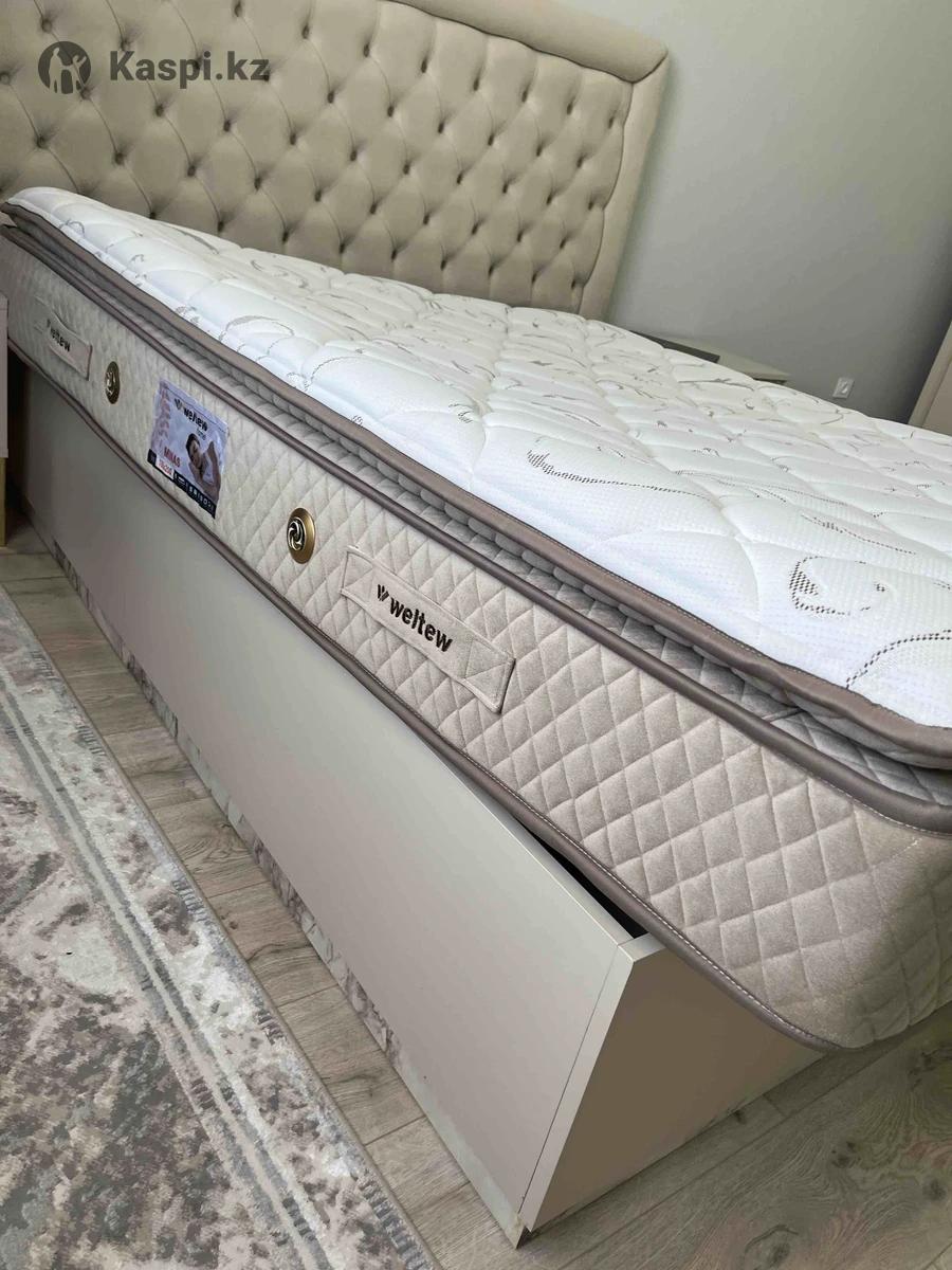 Продаю полностью укомплектованный спальный гарнитур от турецкого бренда Weltew. Мебель из натурального дерева, очень тяжелая и добротная, выполнена в элегантном кофейном оттенке. В комплект входят: 1. Двуспальная кровать с подъемным механизмом (размер 160×200) 2. Ортопедический матрас высотой 30 см 3. Две прикроватные тумбы 4. Комод с зеркалом 5. Четырехдверный шкаф (ширина 2 м) Мебель в отличном состоянии, подойдет для ценителей качества и уюта.