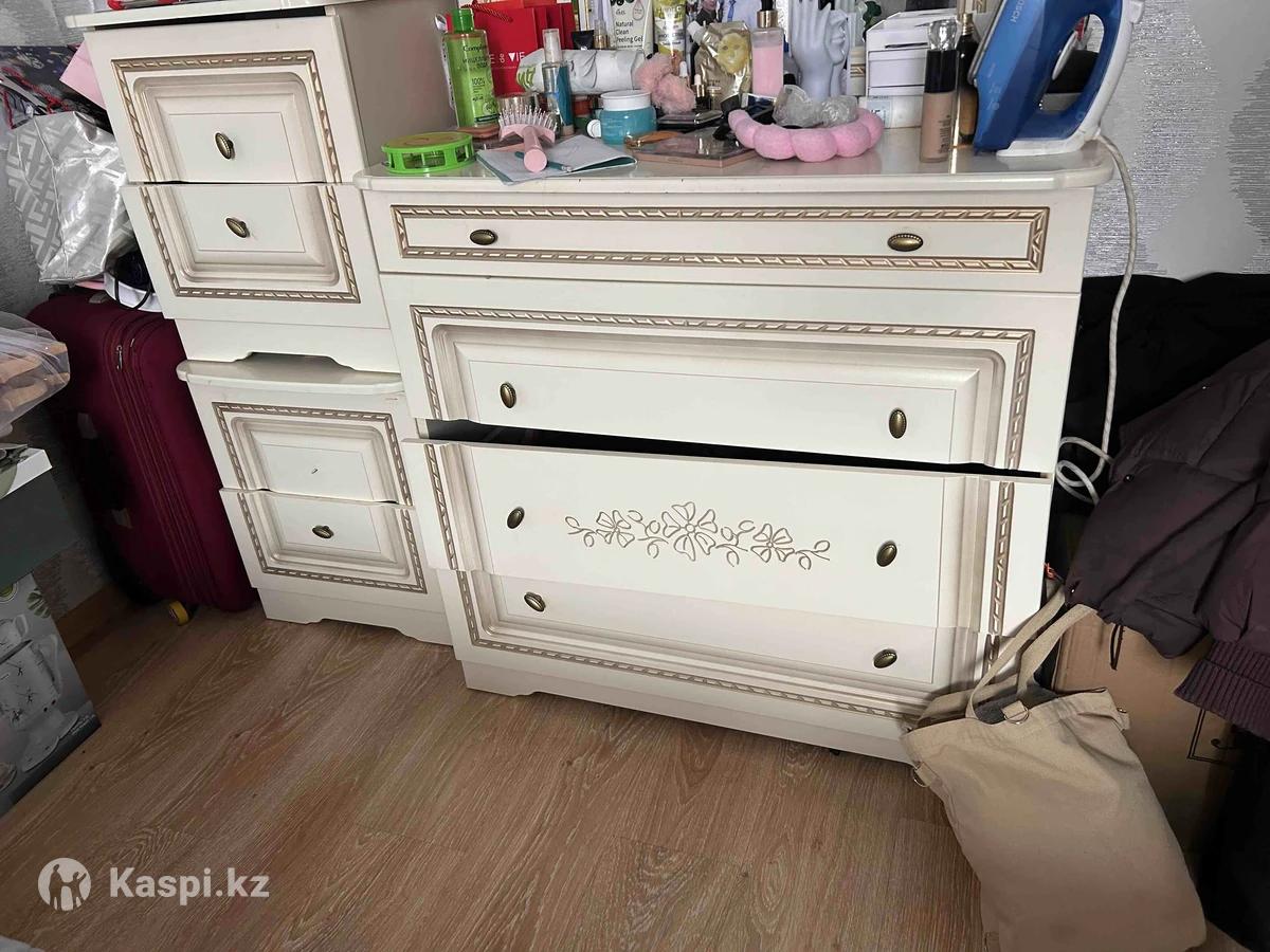 Продам спальный гарнитур. Состояние среднее. Жасайтын жерлери бар. Торг. Самовывоз Кровать,шкаф,тумбы,комод с зеркалом.