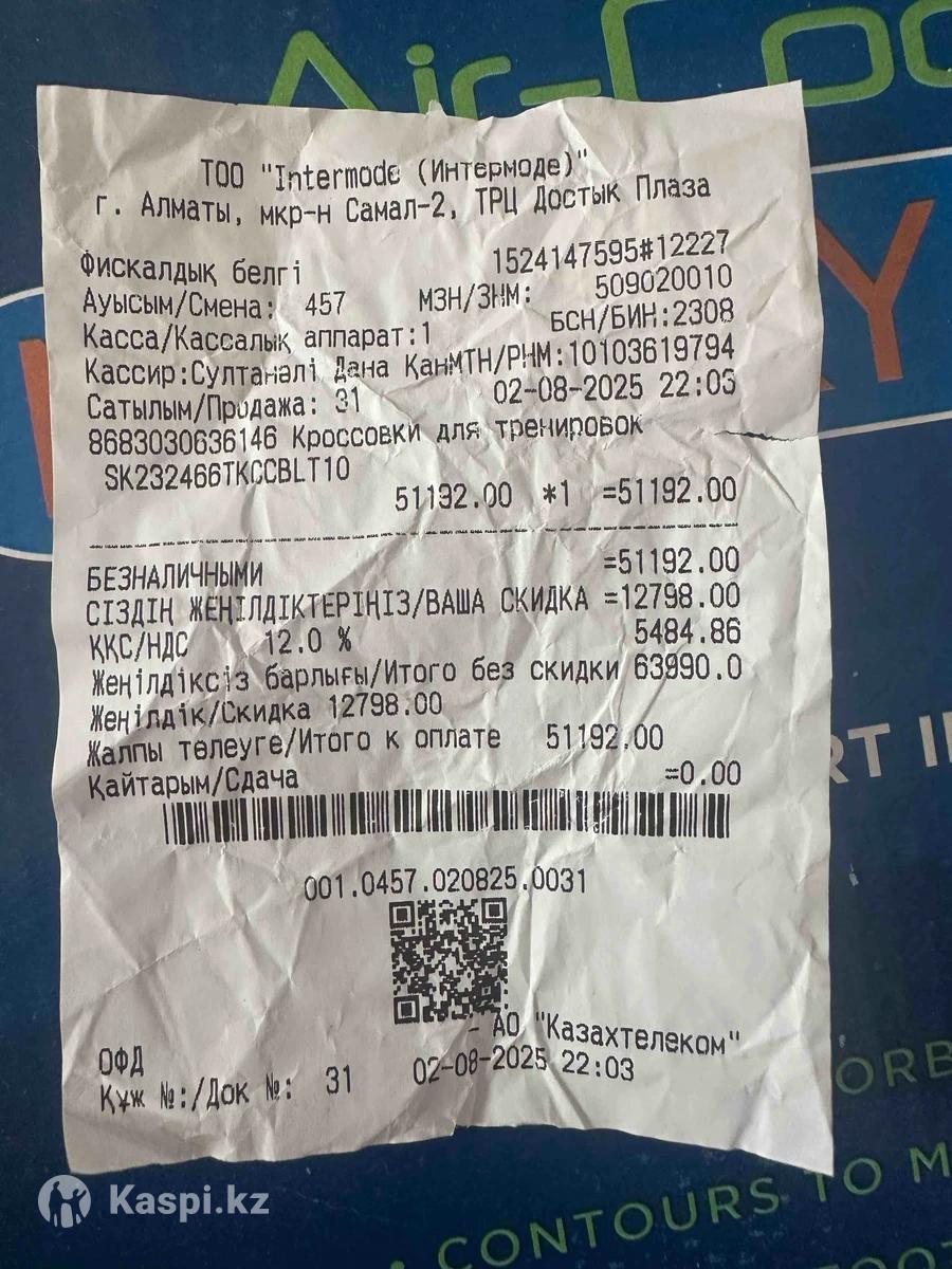 Новые кроссовки, одевал 1 раз, ошибся с размером. Покупались в Достык Плазе со скидкой за 51192 тг. Чек имеется.