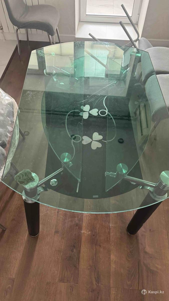 Срочно продается стол стеклянный, овальный, при раскрытии становится круглым, имеется дефект, ножка отклеилась, но можно сделать