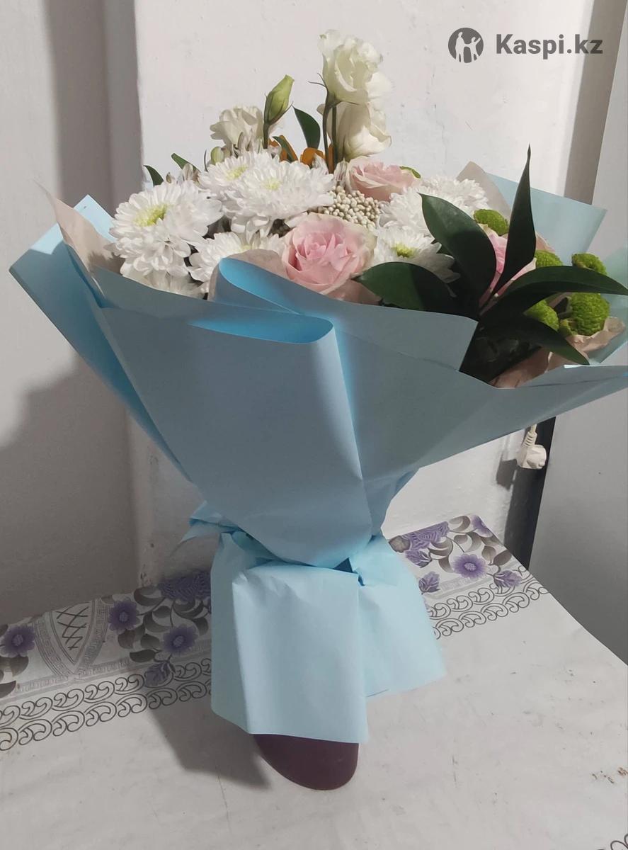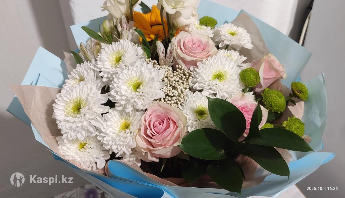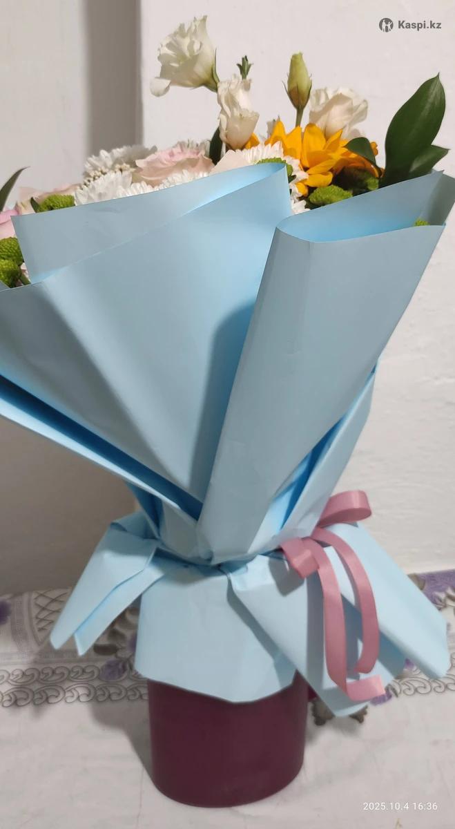 Цветы свежие, букет только вчера собран, хранится в воде. Упаковка в голубой плёнке, выглядит как новый.