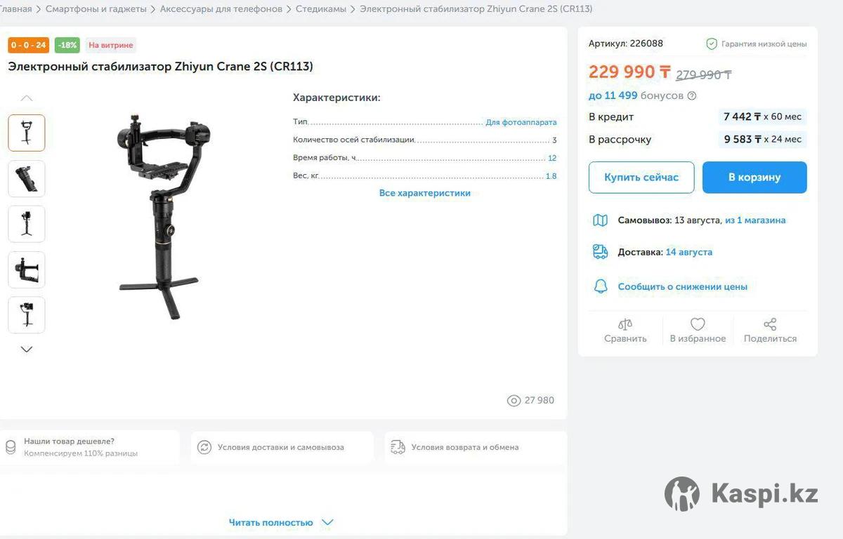 3-х осевой профессиональный стабилизатор Crane 2S. Позволяет работать с тяжелыми камерами, имеет модульную конструкцию и способен обеспечить стабильную работу и высокую производительность в сложных условиях съемки. 🔹Мощные моторы 🔹Удобный режим вертикальной съемки 🔹Съемные энергоемкие аккумуляторы для максимальной продолжительности работы 🔹Crane 2S обеспечивает удобный доступ к шести режимам работы Состояние новое, пользовался пару раз. Причина продажи, не подходит к SONY A6700 (перешел на DGI) В магазинах стоит 220-260.000 P.S.: Оплата наличными и только тем кто в Алматы