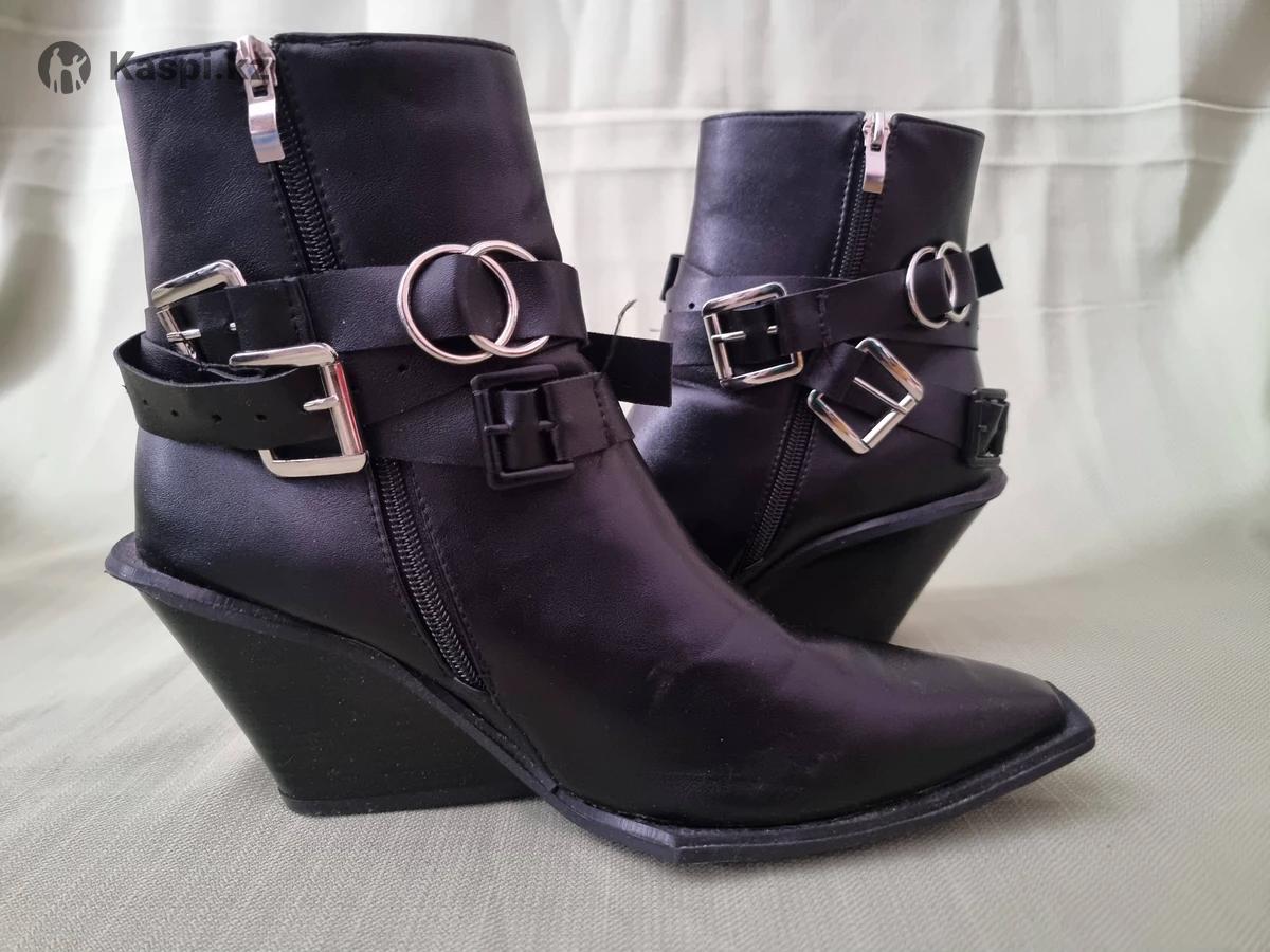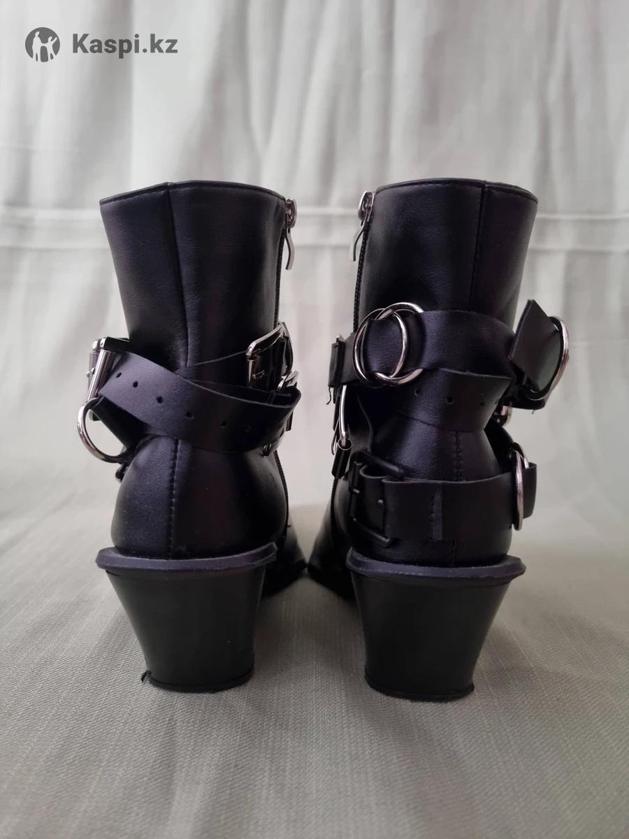 Женские ботильоны черного цвета на устойчивом каблуке. Острый нос, лаконичный силуэт с декоративными ремешками и металлическими кольцами. Материал верха — эко-кожа, подкладки нет. Каблук устойчивый, средней высоты, удобная колодка. Застежка на молнии сбоку. Состояние хорошее, есть незначительные следы носки. Размер 39–39,5. Подойдут для выходов, стильных образов.