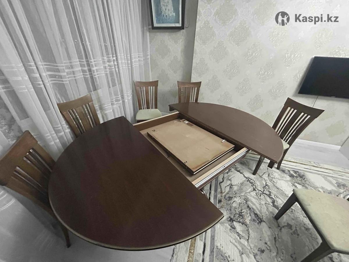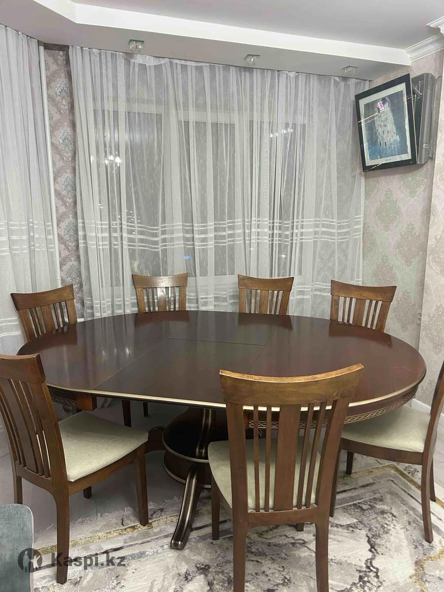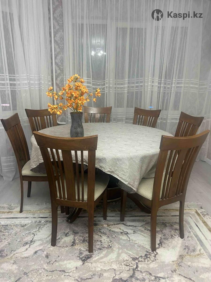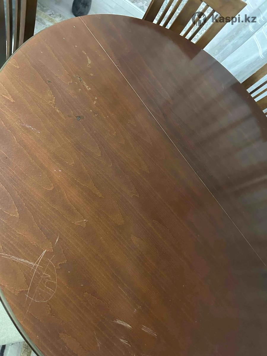 Продается круглый стол + 7 стульев в подарок. Размеры стола: • в собранном виде — 1,5 × 1,5 м • в раздвинутом виде — 1,5 × 2 м Стол удобный, вместительный, отлично подойдет для большой семьи или гостей. Есть дефекты на столешнице: царапины и прожженность (на фото все видно). Покупали в «Алина и К». Цена — 90 000 тг, торг возможен. Самовывоз