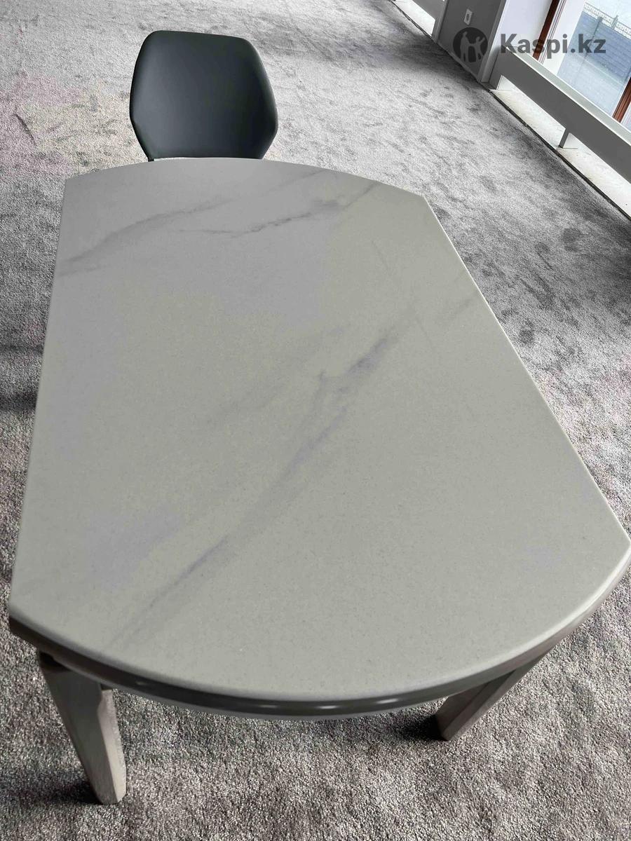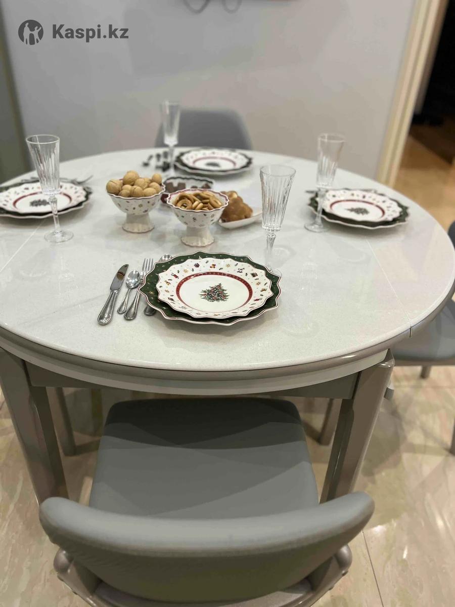 Стол кухонный , ножки дерево , покрытие стола камень . Качество шикарное . Вместимость гостей 10 человек . Стулья очень удобные , практичные , легко протираются . Цена 170 000 стол , стулья 28000 . Отдаем по себестоимости . Размер стола 130 130 в круглом виде , в собранном 130 80