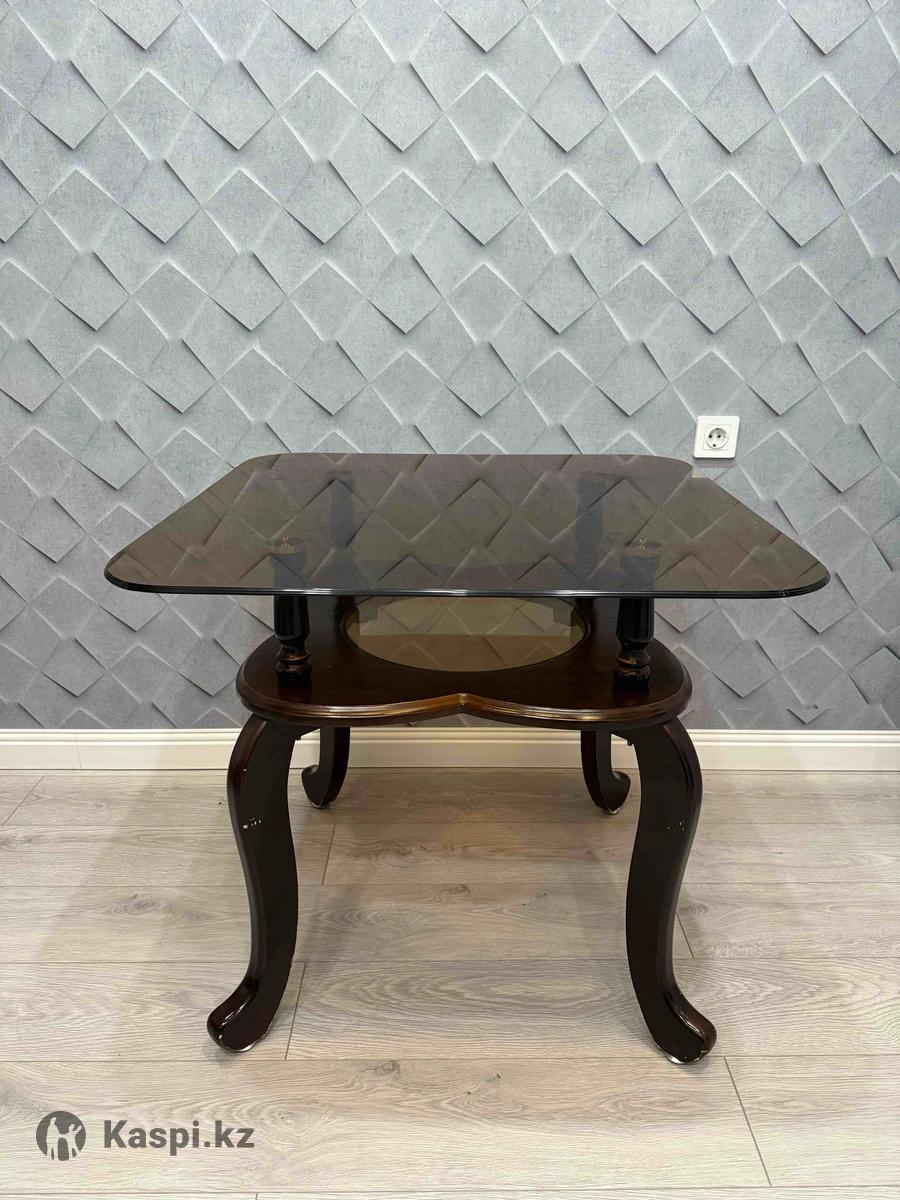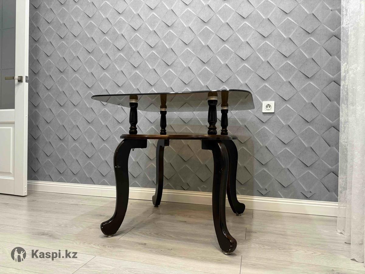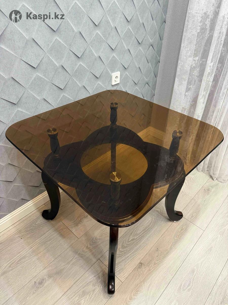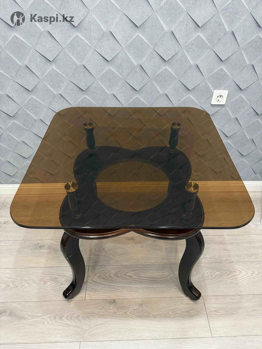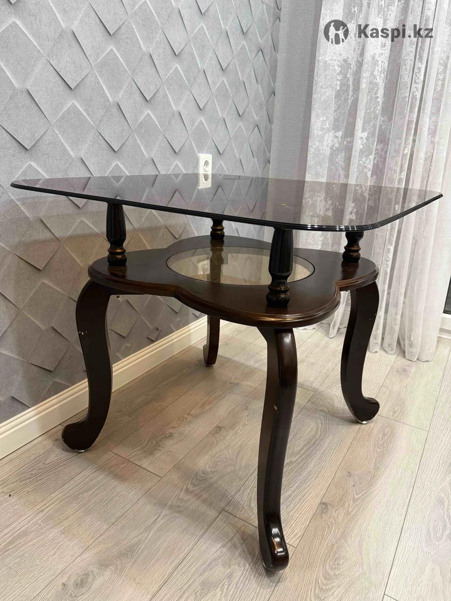 Кухонный стол в хорошем состоянии. Прочный, сверху стекло, снизу тоже отдельно стекло, небольшим диаметром, сверху ставится при установке Длина стола 110см (стекло). Ножки дерево . Самовывоз