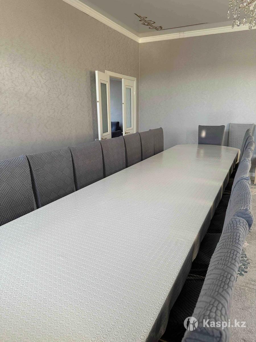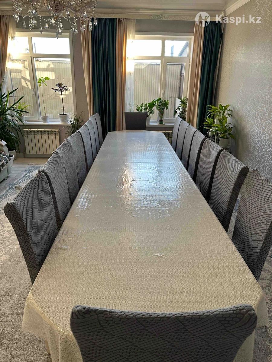 Стол в длину 4,5 метра .Цвет кремовый.С куриными ножками.Стулья 20 штук,в подарок идут новые чехлы