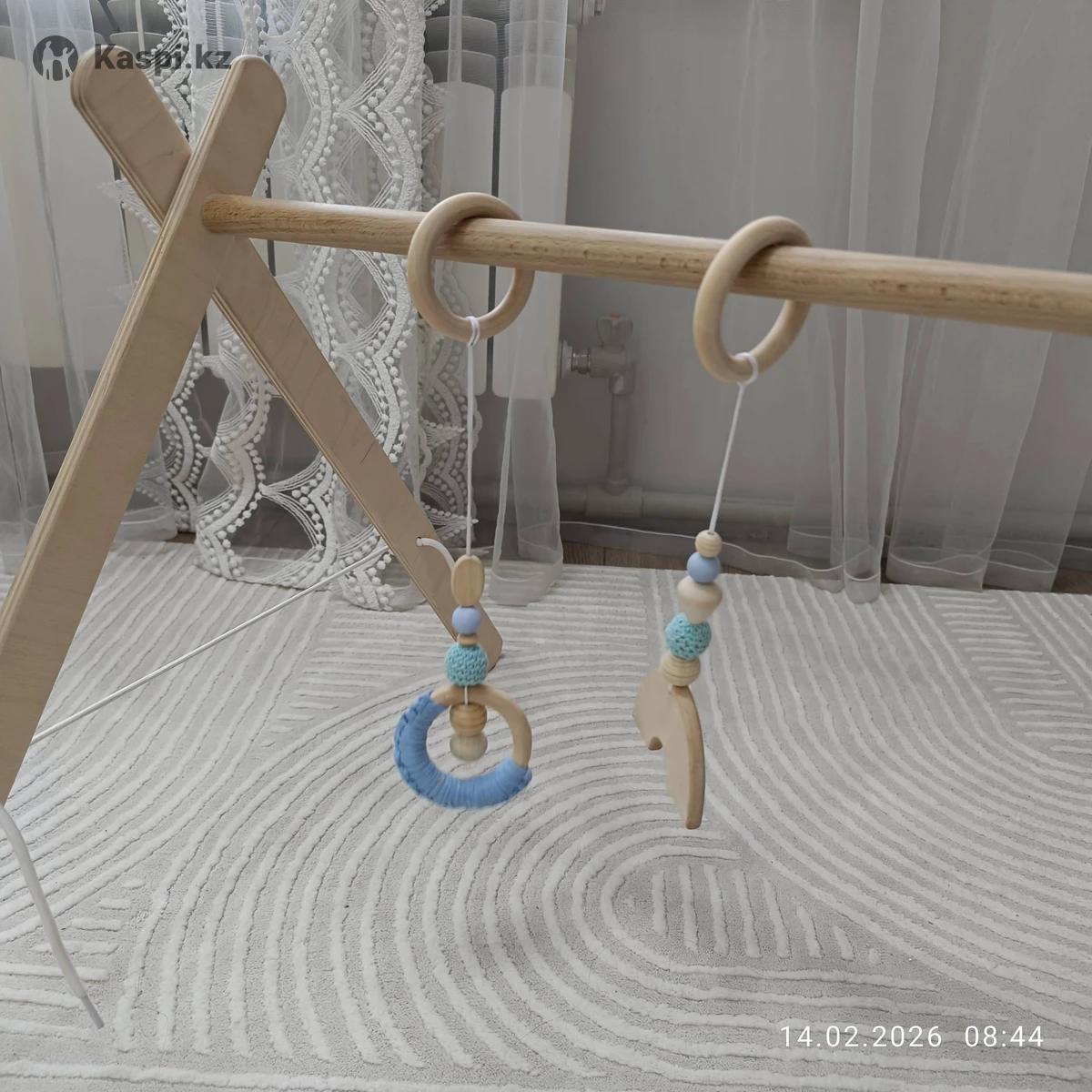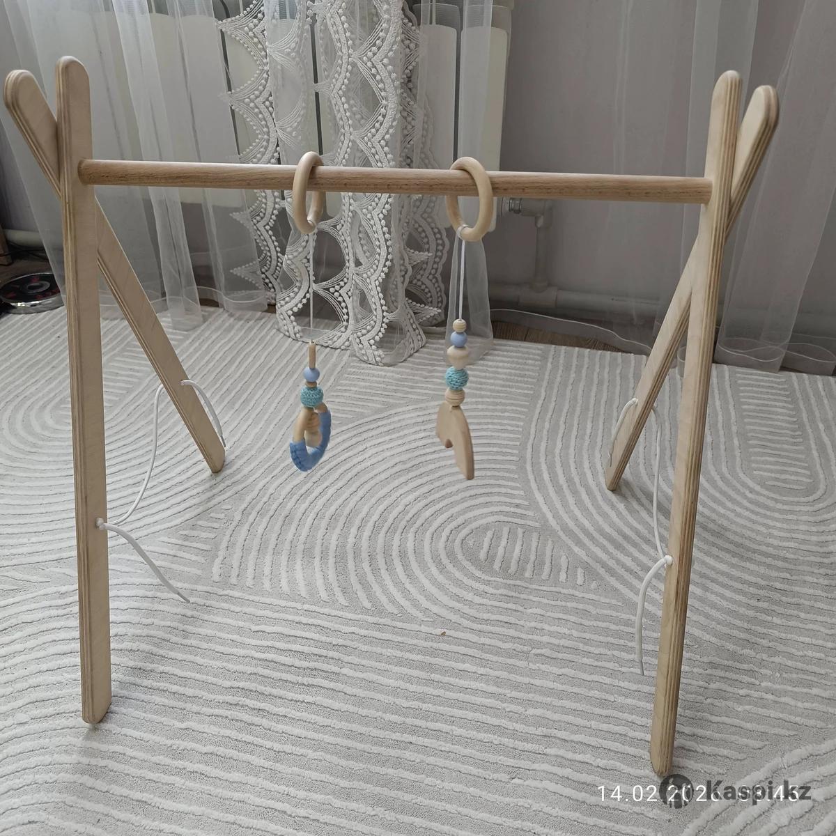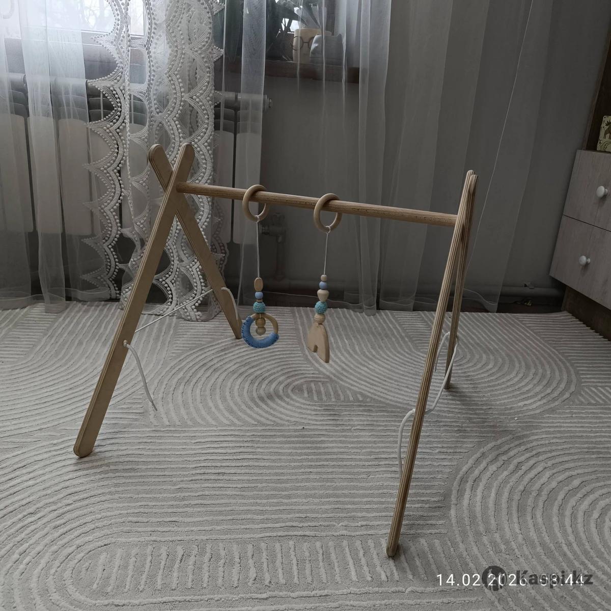 Стойка деревянная в хорошем состоянии после одного новорожденного. В комплекте 2 деревянных подвеса, регулируется шнурками. Устойчивая. Отличная развивашка для новорожденных