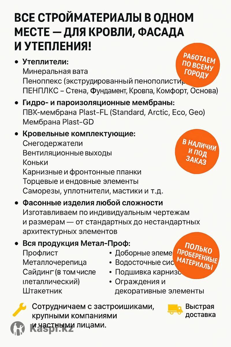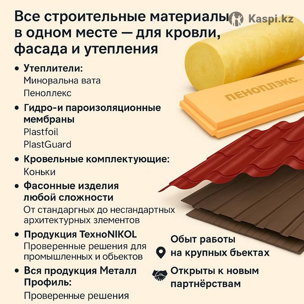Все стройматериалы в одном месте — для кровли, фасада и утепления! Предлагаем широкий ассортимент строительных материалов по выгодным ценам: 🔹 Утеплители: Минеральная вата Пеноплекс (экструдированный пенополистирол ПНПЛКС — Стена, Фундамент, Кровля, Комфорт, Основа) 🔹 Гидро- и пароизоляционные мембраны: ПВХ-мембрана Plastfoil (Standard, Arctic, Eco, Geo) Мембрана PlastGuard 🔹 Кровельные комплектующие: Снегозадержатели Вентиляционные выходы Коньки Карнизные и фронтонные планки Торцевые и основные элементы Саморезы, уплотнители, мастики и т.д. 🔹 Фасонные изделия любой сложности Изготавливаем по индивидуальным чертежам и размерам — от стандартных до нестандартных архитектурных элементов. 🔹 Продукция ТехноНиколь — тепло- и гидроизоляция, проверенная временем. 🔹 Сэндвич-панели KazPan — качественные панели для промышленных и коммерческих объектов. 🔹 Вся продукция Металл Профиль: Профлист Металлочерепица Сайдинг (в том числе металлический) Штакетник Фасадные кассеты Линейные панели Сэндвич-панели Мембраны Доборные элементы Водосточные системы Подшивка карнизов Ограждения и декоративные элементы 🔧 Собственная сертифицированна строительная бригада — специалисты с опытом монтажа кровли, фасадов, утепления и декоративной отделки. 🏗 Опыт работы на крупных объектах: Склад AIKOS Автосалон Hyundai Norma Супермаркет у стадиона И множество других коммерческих и частных проектов 🤝 Сотрудничаем с застройщиками, крупными компаниями и частными лицами. Открыты к новым партнерствам и долгосрочному сотрудничеству. 📦 Все в наличии и под заказ 🚚 Быстрая доставка 📞 Звоните или пишите — поможем подобрать материалы и команду под ваш проект любого масштаба!