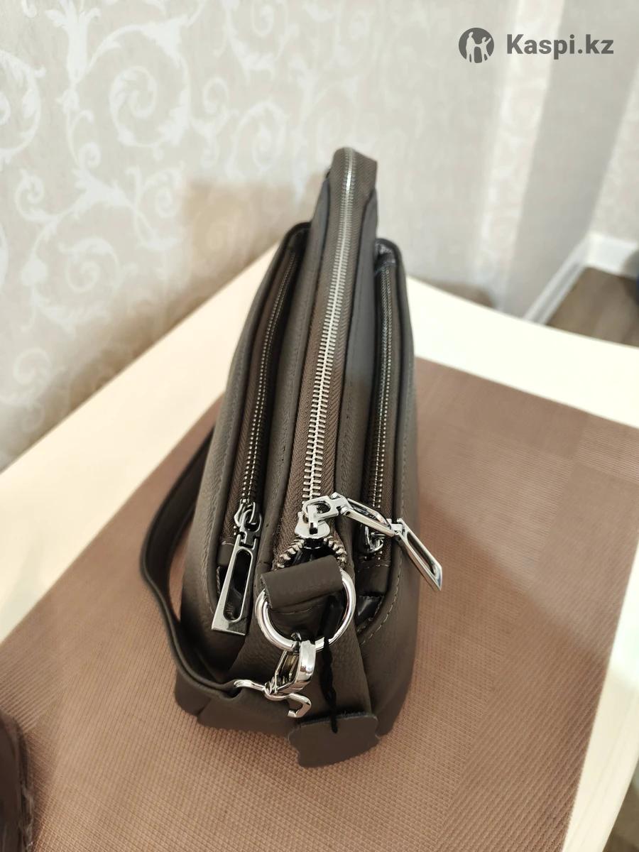 Натуральная кожа. Три отдела на замках. Есть еще карманы внутри. Два ремешка.