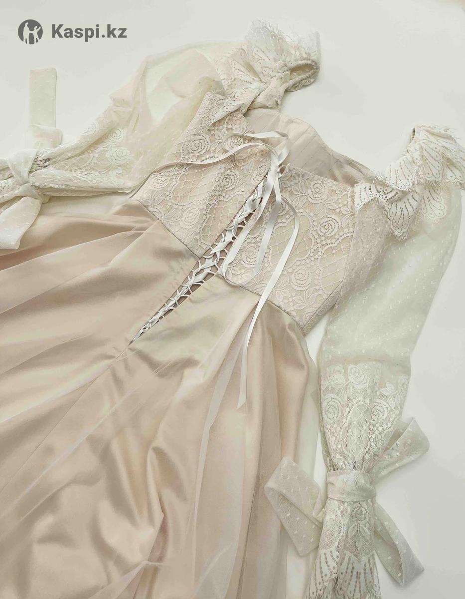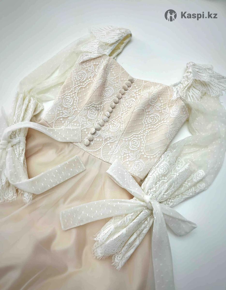 Дизайнерское платье от казахстанского дома моды Kunkei. Было надето однажды. Размер S. Французское кружево, итальянский атлас. В единственном экземпляре. В комплекте имеется пышный подъюбник. Сзади регулируется корсетом. Цена окончательная