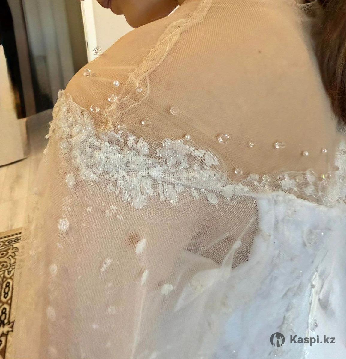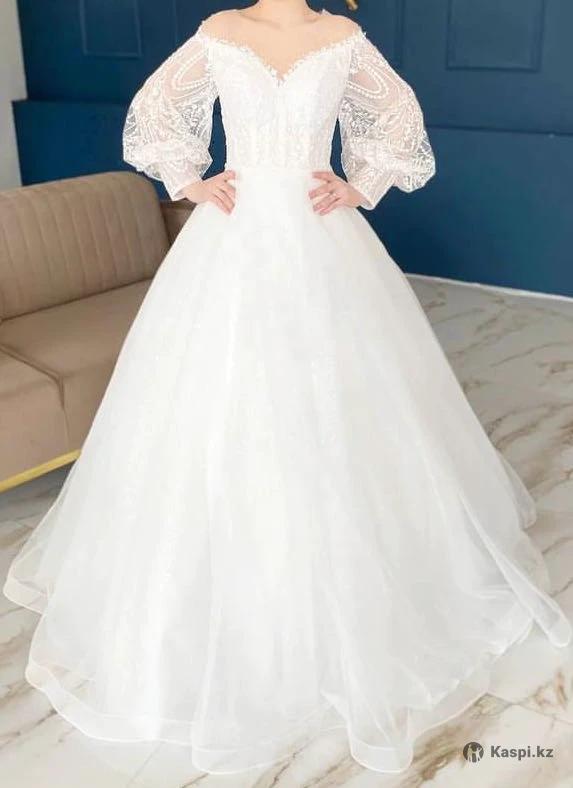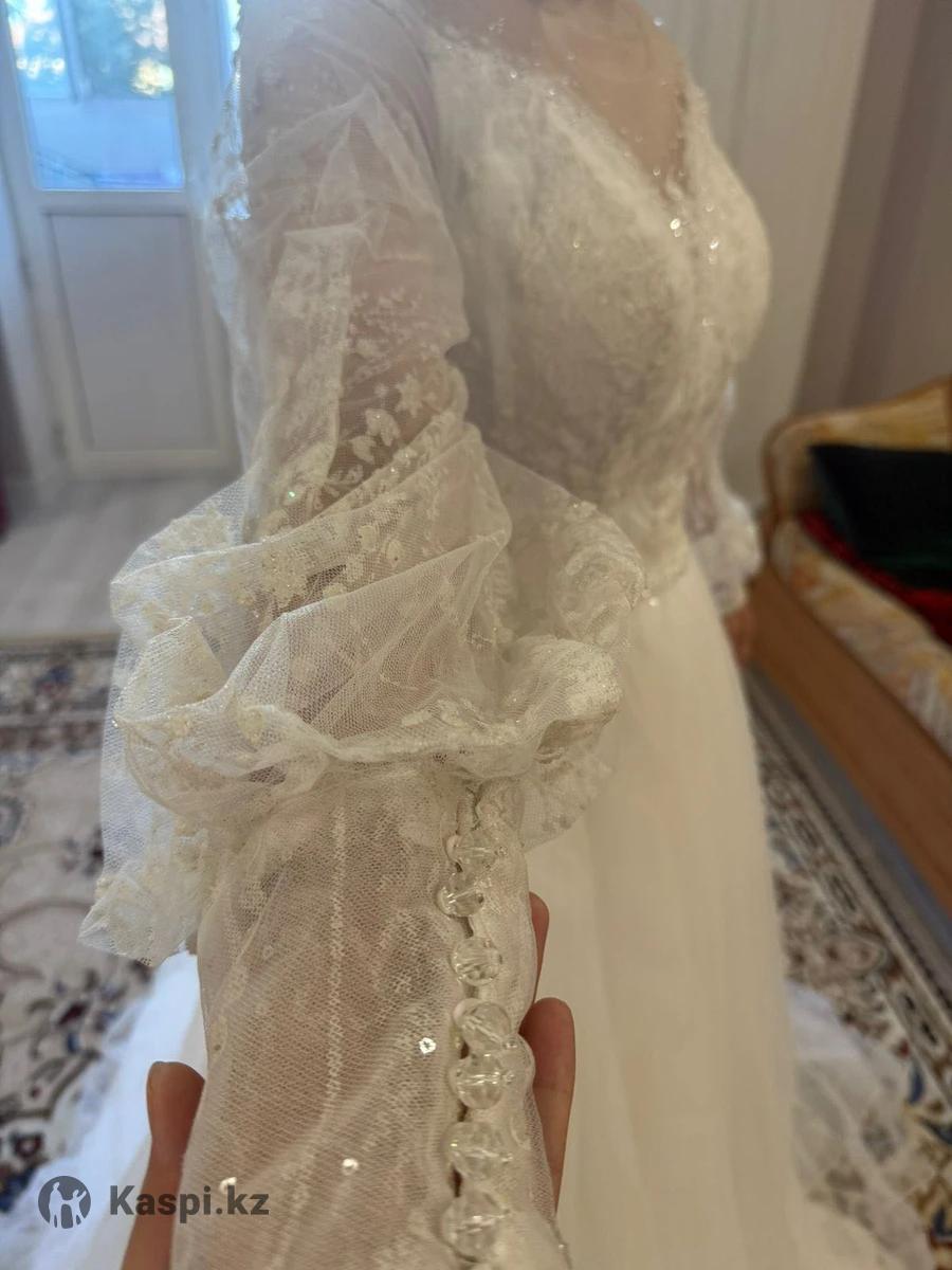 Роскошное свадебное платье с длинными кружевными рукавами Продаю нежное и элегантное свадебное платье цвета айвори. • Размер: примерно 42–44 • Корсет с мягкими чашками, отлично держит форму и подчеркивает фигуру • Пышная фатиновая юбка, красиво струится и придает объем, нижний слой украшен пайетками • Длинные прозрачные фонари рукава из кружева с изящной вышивкой • иллюзия открытых плеч, вверх оформлен тонкой сеткой телесного цвета с аккуратной вышивкой украшенный мелкими жемчужинами • Верх украшен нежным кружевом и деликатными блестками •Пояс украшен аккуратной линией страз и подчеркивает талию, на свету переливаются пайетки и стразы • Застежка — пуговицы + корсет пояс • Очень удобное, легкое и не сковывает движения • Надето один раз, в идеальном состоянии, нужно будет погладить только Отличный вариант для торжества, фотосессии и ЗАГСа. Цена договорная. Возможна примерка. Город Астана. Не звонить пишите на