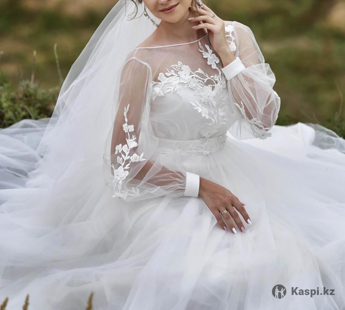 Платье надевалось только на фотосессию, в идеальном состоянии, состоит из двух частей, нижнее платье с корсетом и юбкой(без лямок), вторая часть-сетка украшенная цветами, с длинным рукавом, подойдет платье на размер 40-42-44. Фаса и кольцо так же есть.