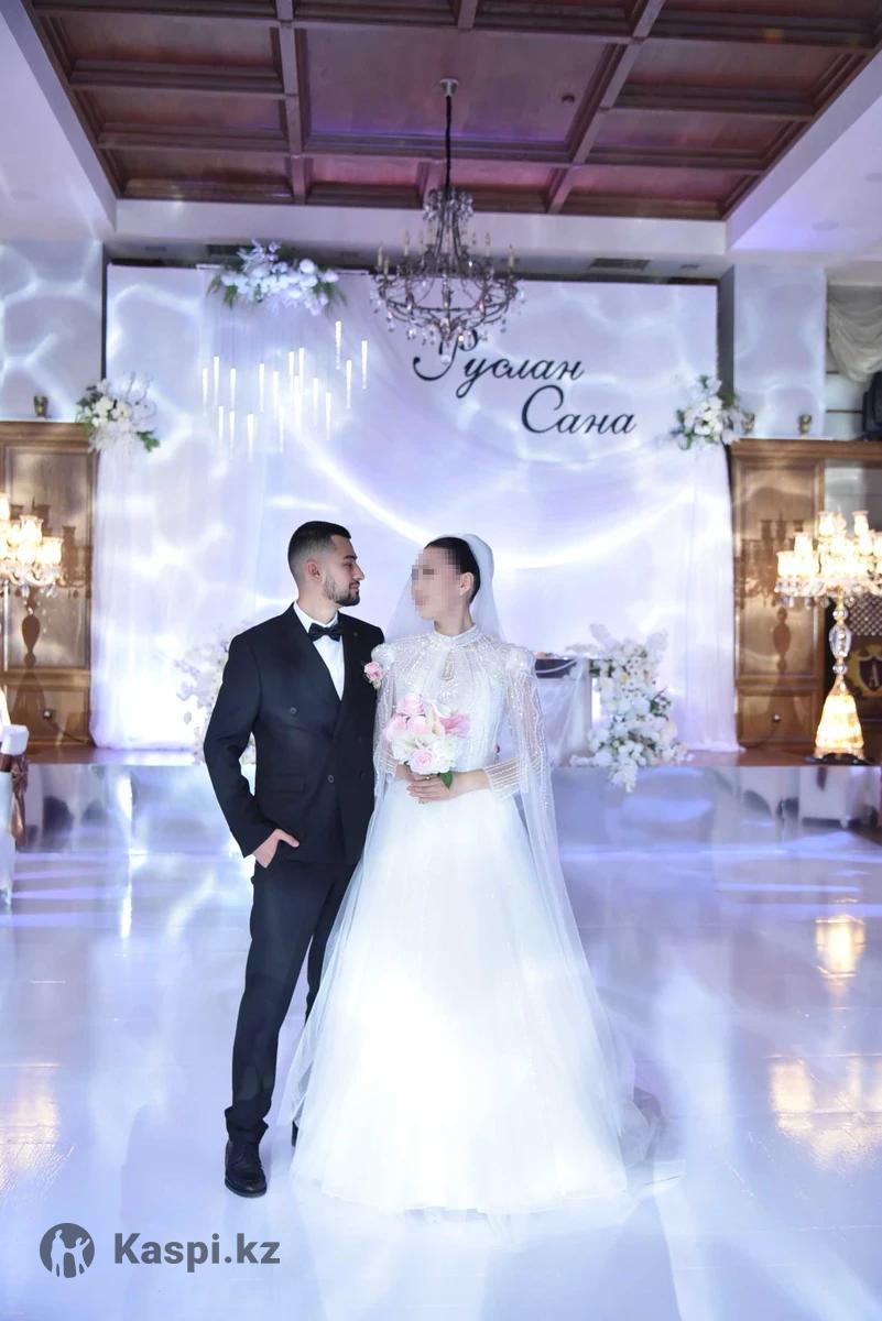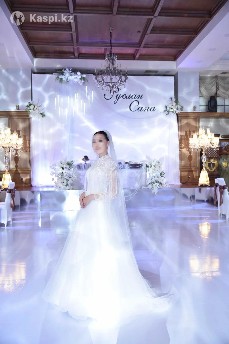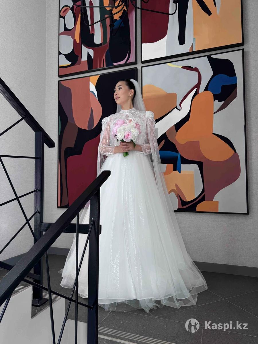 свадебное платье от Helena Nabokina Город Караганда Мой рост 175 , размер М (46) , платье благодаря регулировке подойдет S-M (42-48) Снимается кейп и рукава с плечиками Платье настоящей принцессы. В меру пышное, легкое, воздушное, удобное. Я танцевала без скованностей. Оно шикарно блестит под софитами. Собрала очень много комплиментов по поводу платья. Покупала за 240 тыс Продам за 190 тыс тг В подарок фата в пол (как на фото) и кольцо