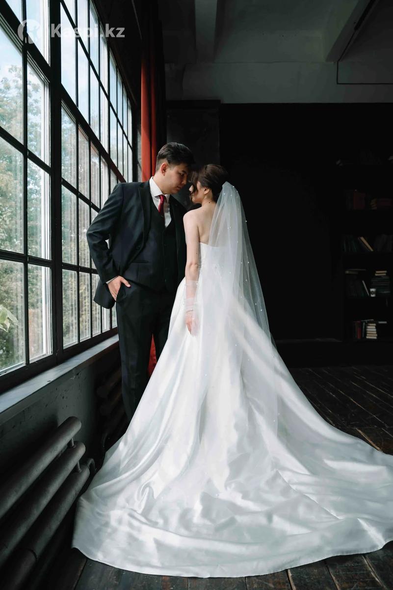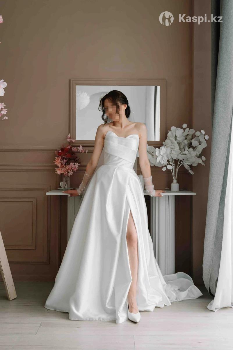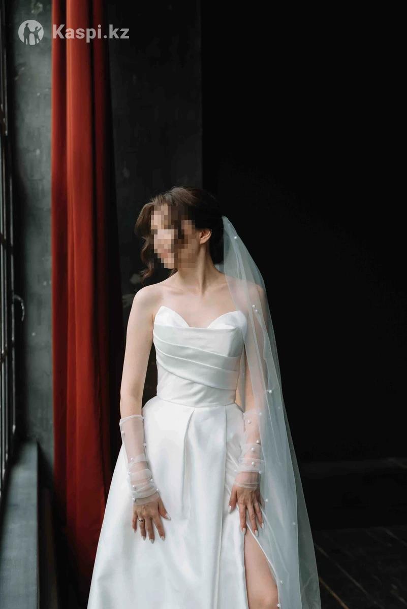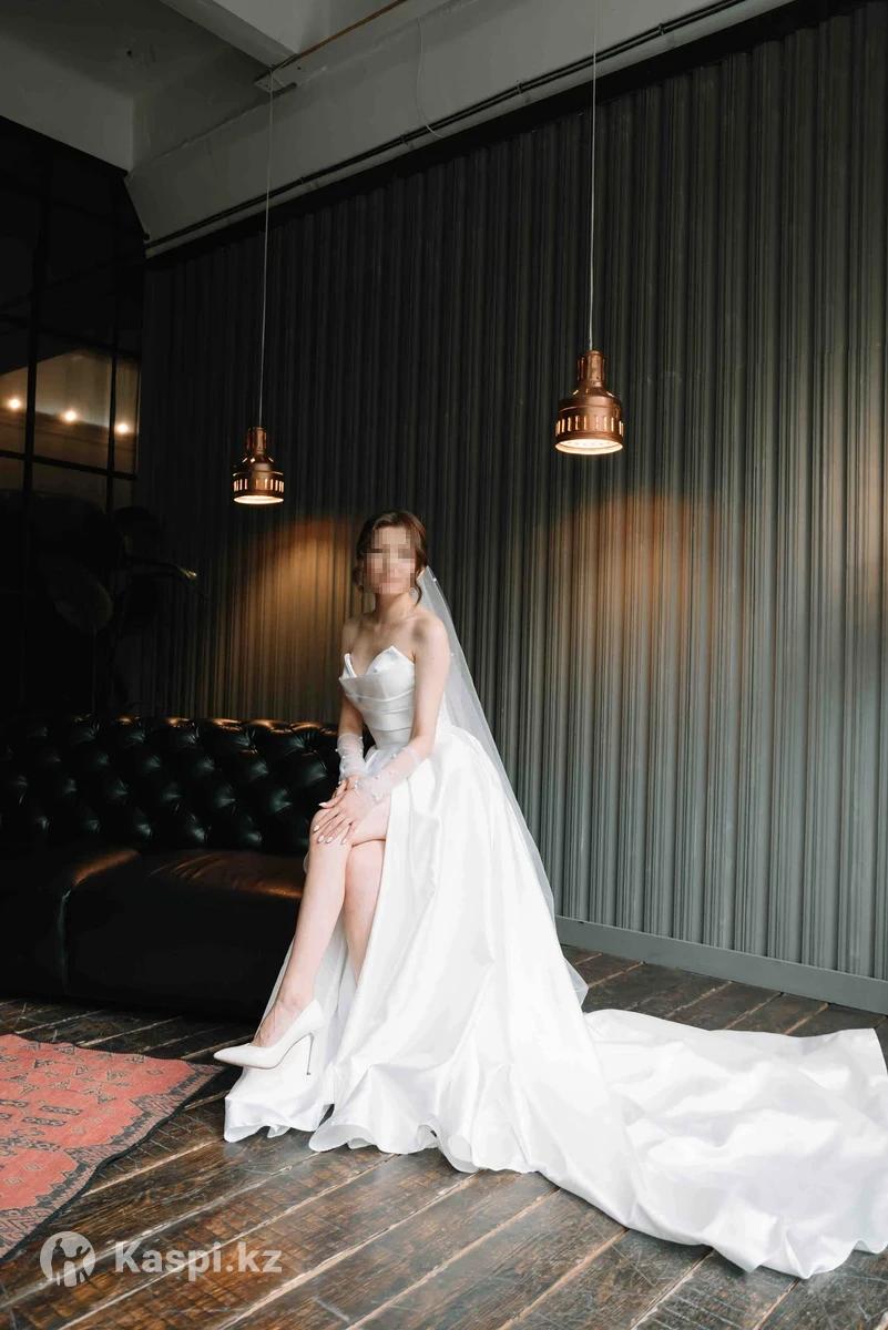 Свадебное платье А-силуэт с разрезом и шлейфом, размер XS Покупала за 520 000 тг. Очень эффектное — элегантный разрез на ноге и аккуратный шлейф. Подойдёт на рост 158–165 см (я 159 см + каблук 10 см). Лёгкое, удобное, не тяжёлое. Примерка в Астане. Разумный торг возможен. В подарок отдам классическую фату (новую)