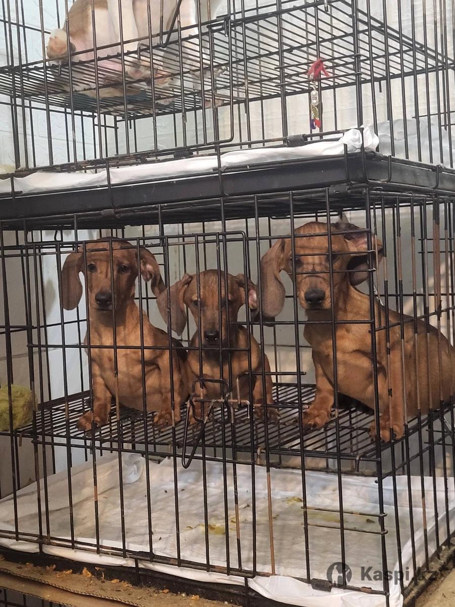 Чистокровные таксята 2,5 месяца,остались 2 мальчика и 1 девочка.Очень умные,шустрые милашки.Есть паспорт здоровья.Проглистогонены,прививки по возвросту сделаны.Едят все.Цена 100 000т. Находимся в районе Парка Горького.