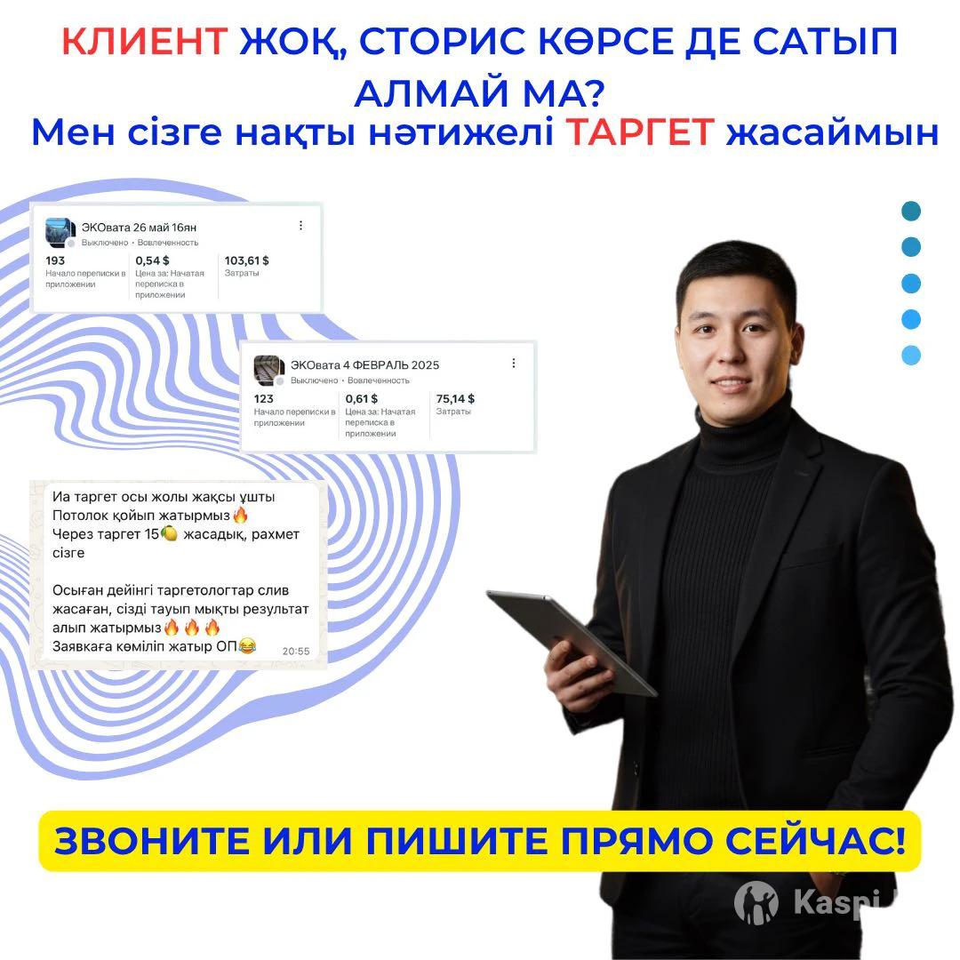 Мен — тәжірибелі таргетолог, сіздің бизнесіңізге нақты клиент алып келемін. ✅ Instagram / TikTok / Facebook жарнамасы ✅ Күнделікті есеп пен аналитика ✅ Клиентті нақты қалаңыздан табу ✅ 1 аптада нәтиже көресіз Бюджетіңізге қарай жеке жоспар жасаймын. 📲 : 💬 Тегін консультация — дәл қазір жазылыңыз!