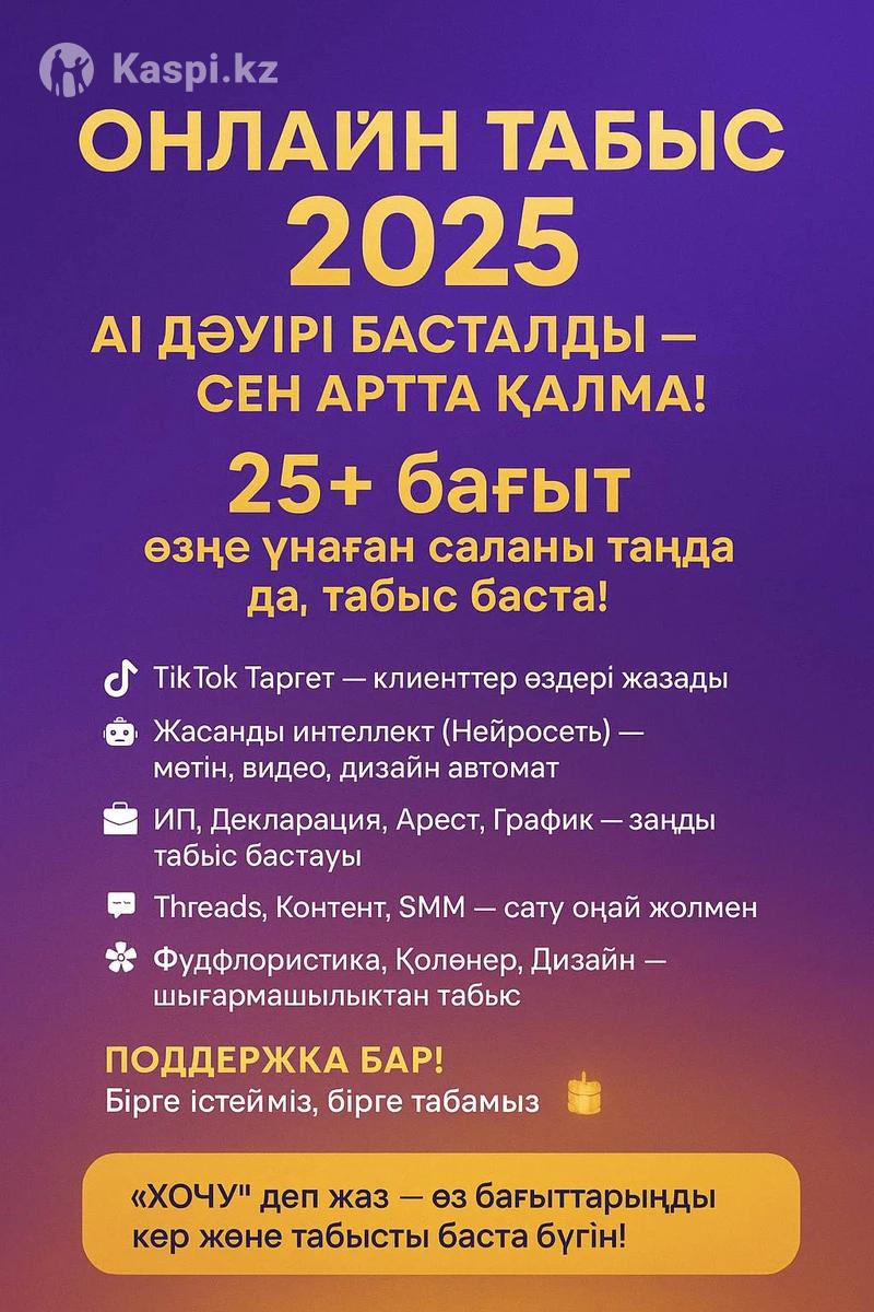 Начни зарабатывать онлайн уже сегодня! Обучение современным профессиям 2025 года: TikTok Таргет Искусственный интеллект (Нейросеть) ИП, декларации, аресты, графики Threads, Контент, SMM Фудфлористика, Хенд мейд, Дизайн Мобилография, СММ, личный бренд, Контент без показа лица и многое другое Обучение проходит онлайн в удобное время. Доступ к материалам 24/7. Поддержка и помощь до результата. Бонус: психология успеха, отношения с деньгами, техники продаж. Напишите “ХОЧУ” — и получите список всех направлений + инструкцию по началу обучения. Беру не много людей Выбрав нишу Вы можете стать Таргетолог, Мобилограф, аресты можете снимать, продавать выгодно, развить личный бренд и др. Скорее пиши