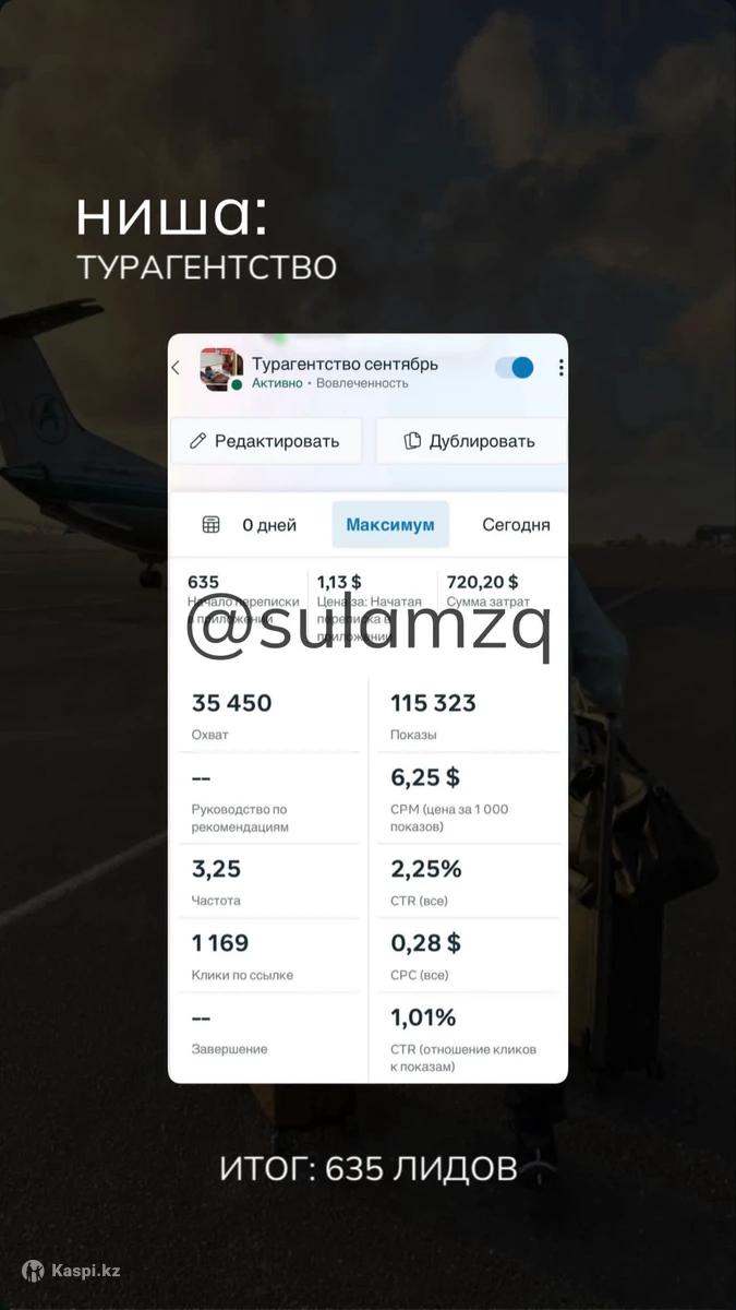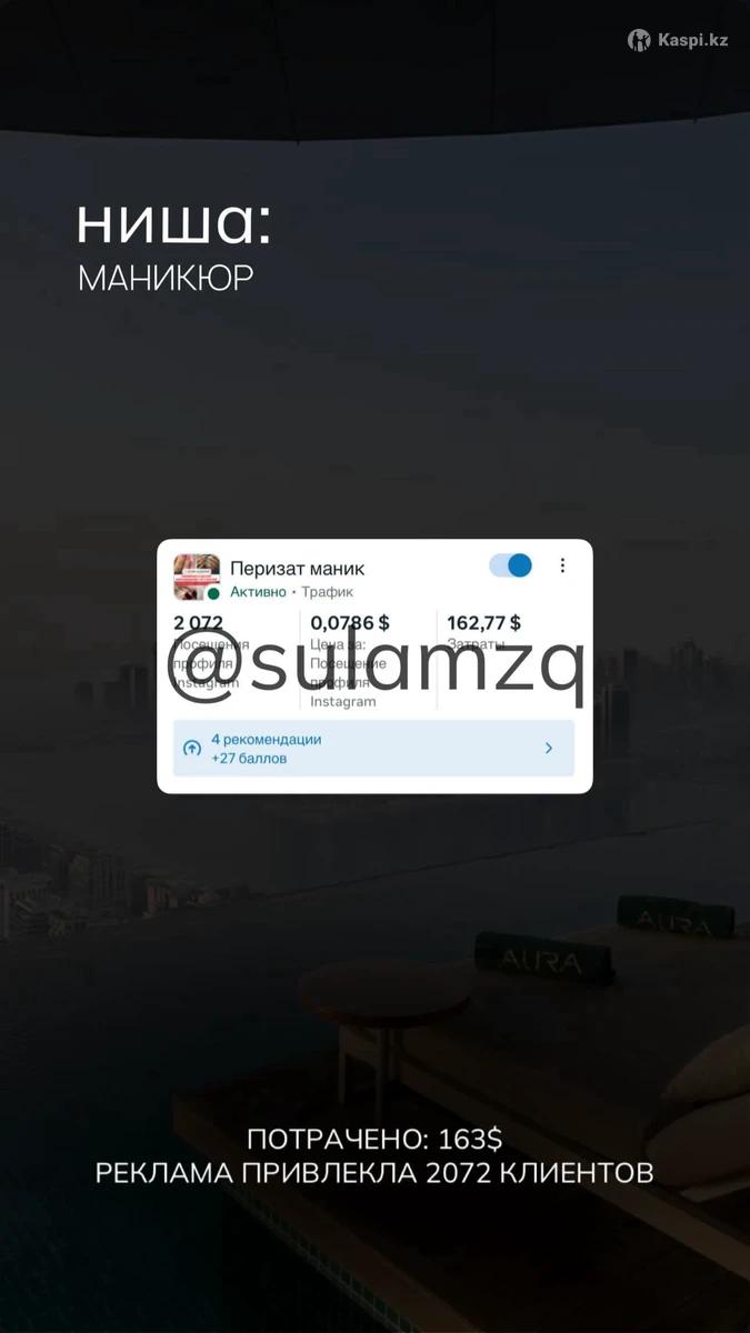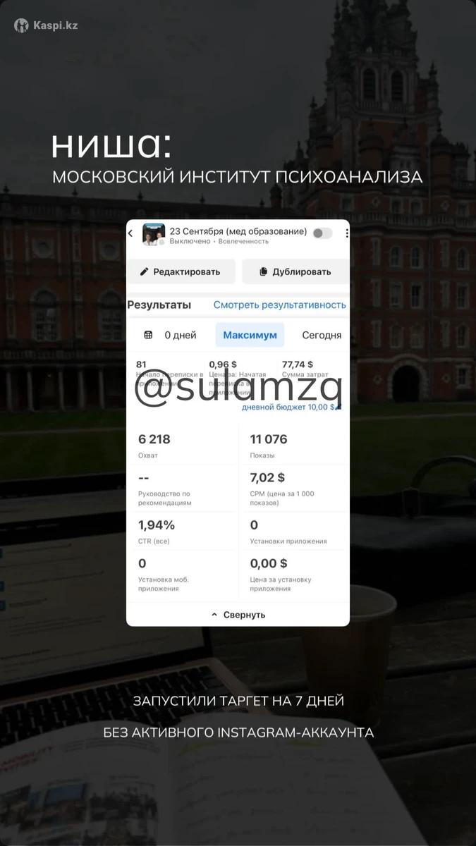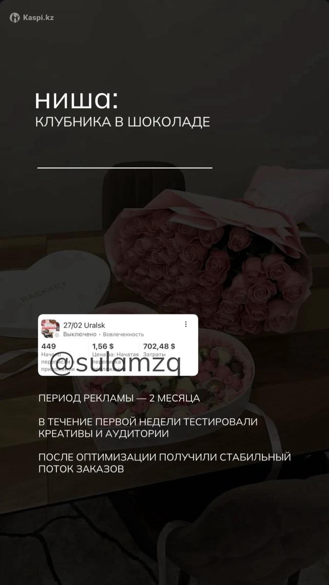 Если вы ищете реально грамотного таргетолога который не обманет, не пропадет, не болеет каждые 2 дня, даст реальный результат - тогда вы по адресу Меня зовут Султан в таргете я 2 года. Проработал более чем с 30-ю проектами и сейчас готов взять ваш проект под работу по выгодным условиям Полная прозрачность работы - вы всегда видите, что и как делается Работаю по официальному договору. Даю гарантию на качество и результат рекламы Звоните и пишите на по номеру который указан снизу
