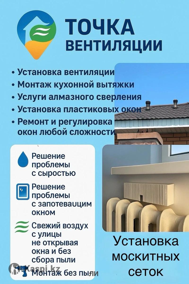 Точка вентиляции — точка свежего воздуха в вашем доме! Предлагаем полный комплекс климатических решений: 1. Бесплатная консультация. 2. Установка систем вентиляции 3. Монтаж и подключение вытяжек 4. Услуги алмазного бурения 5. Установка пластиковых окон 6. Ремонт и регулировка окон любой сложности. 7. Установка москитных сеток Работаем под ключ Современное оборудование Чистый монтаж без пыли Гарантия на все работы Решение проблемы с сыростью Решение проблемы с запотевающим окнам Чистый воздух без открывания окон и сбора пыли. Приток воздуха без выпускания тепла Вентиляционной выход без пропуска воды Частные дома, квартиры, офисы, помещения без окон. Профессиональный монтаж Чистый воздух без пыли Астана и регионы номер тел + Инст: